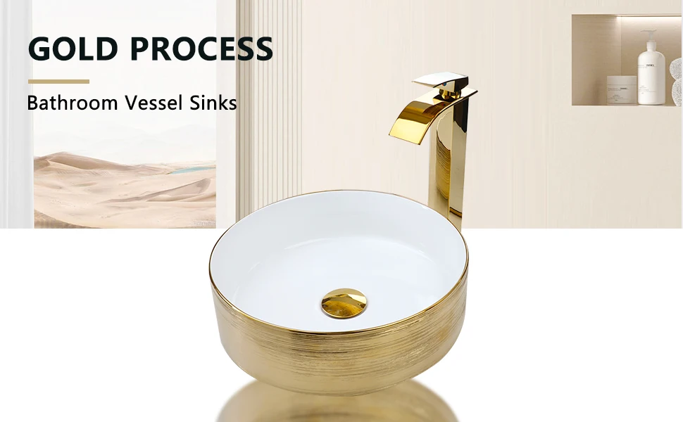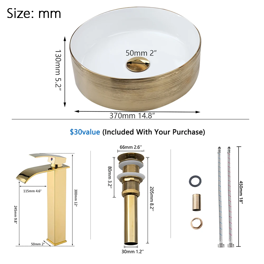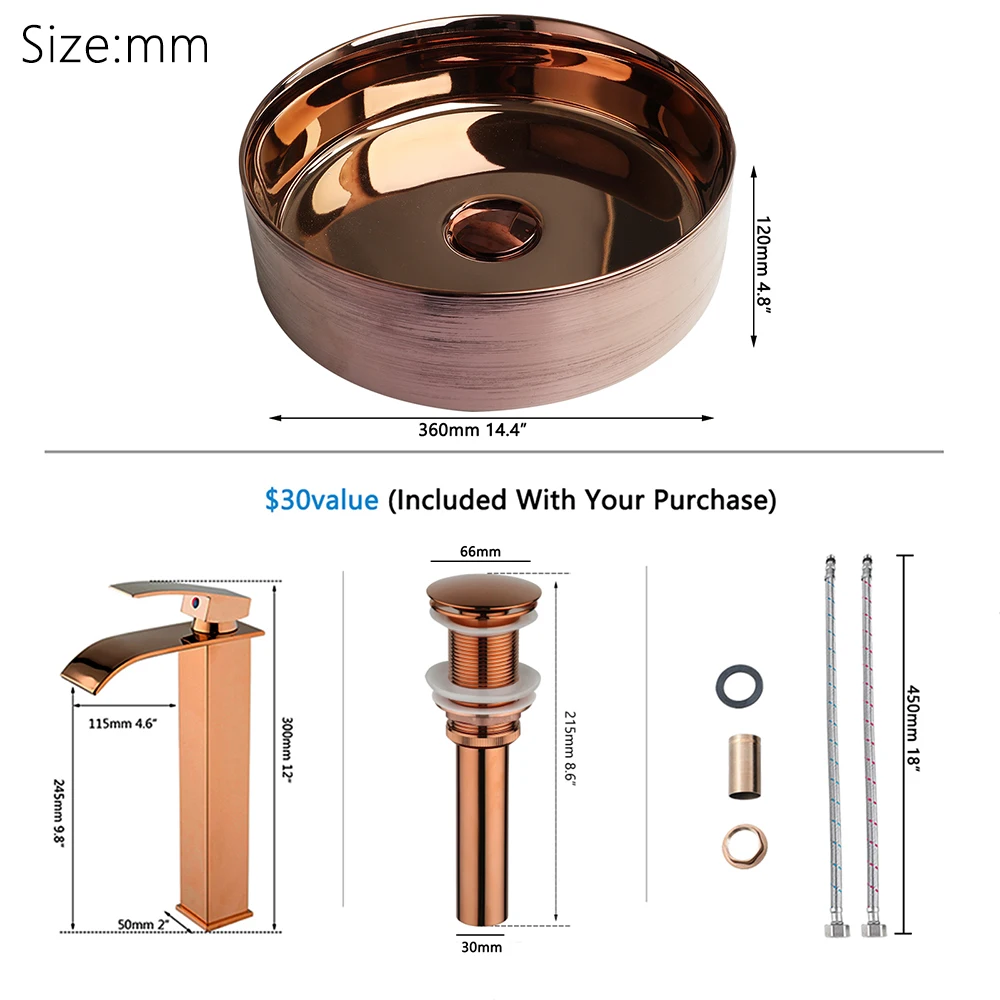 Includes (1) ceramic vessel sink + (1) gold/rose gold mixer faucet + (1) matching pop-up drain. Ready-to-use straight out of the box – no extra parts needed!