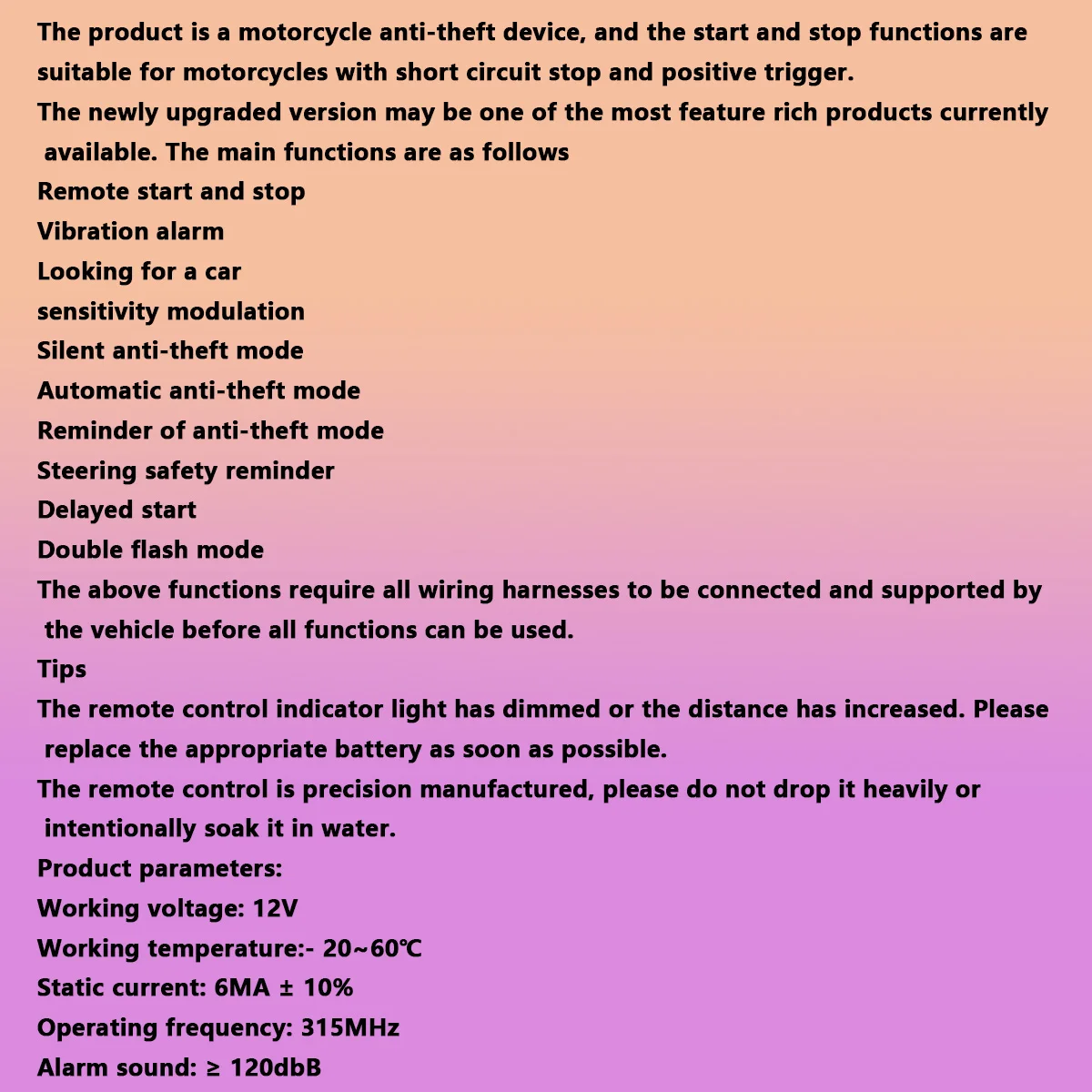 Universal motorcycle anti-theft alarm system increases the safety of motorcycles, supports remote starts and stop, and is easy to use.