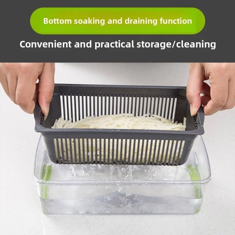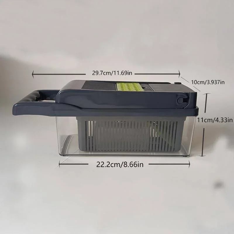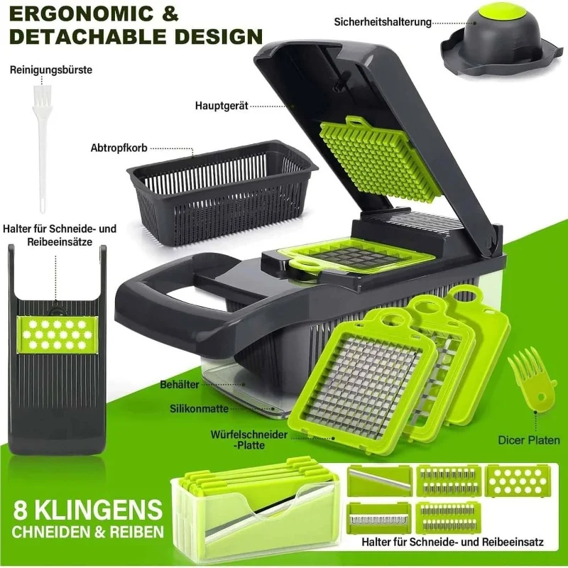 14-in-1 Vegetable Chopper Pro – Made of stainless steel, BPA-free, includes a mandoline slicer and dicer set with a drain basket, compact for storage, and safe to use.