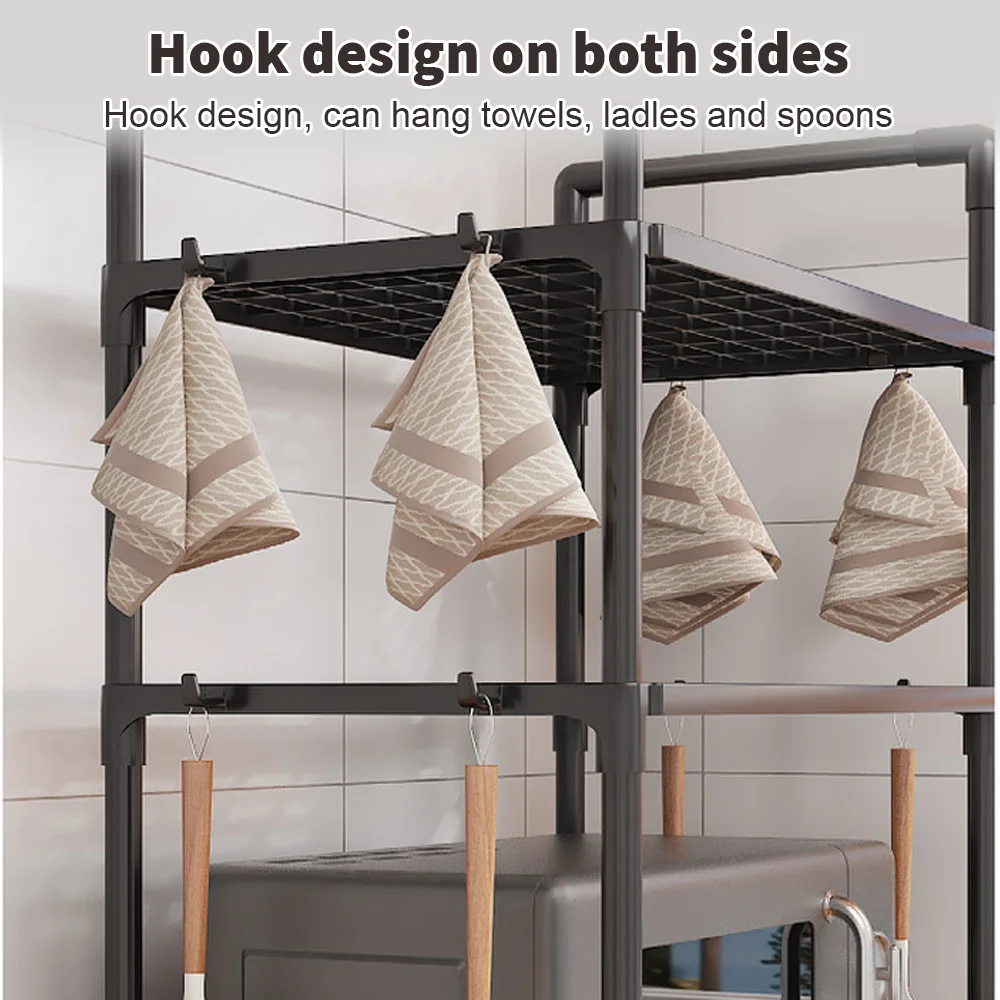 3.Multi-Layer Storage: Say goodbye to clutter and improve work efficiency with this microwave oven rack, which has a rag hook on the side for quickly taking and organizing items.
