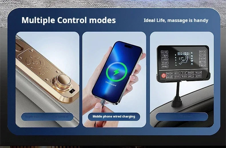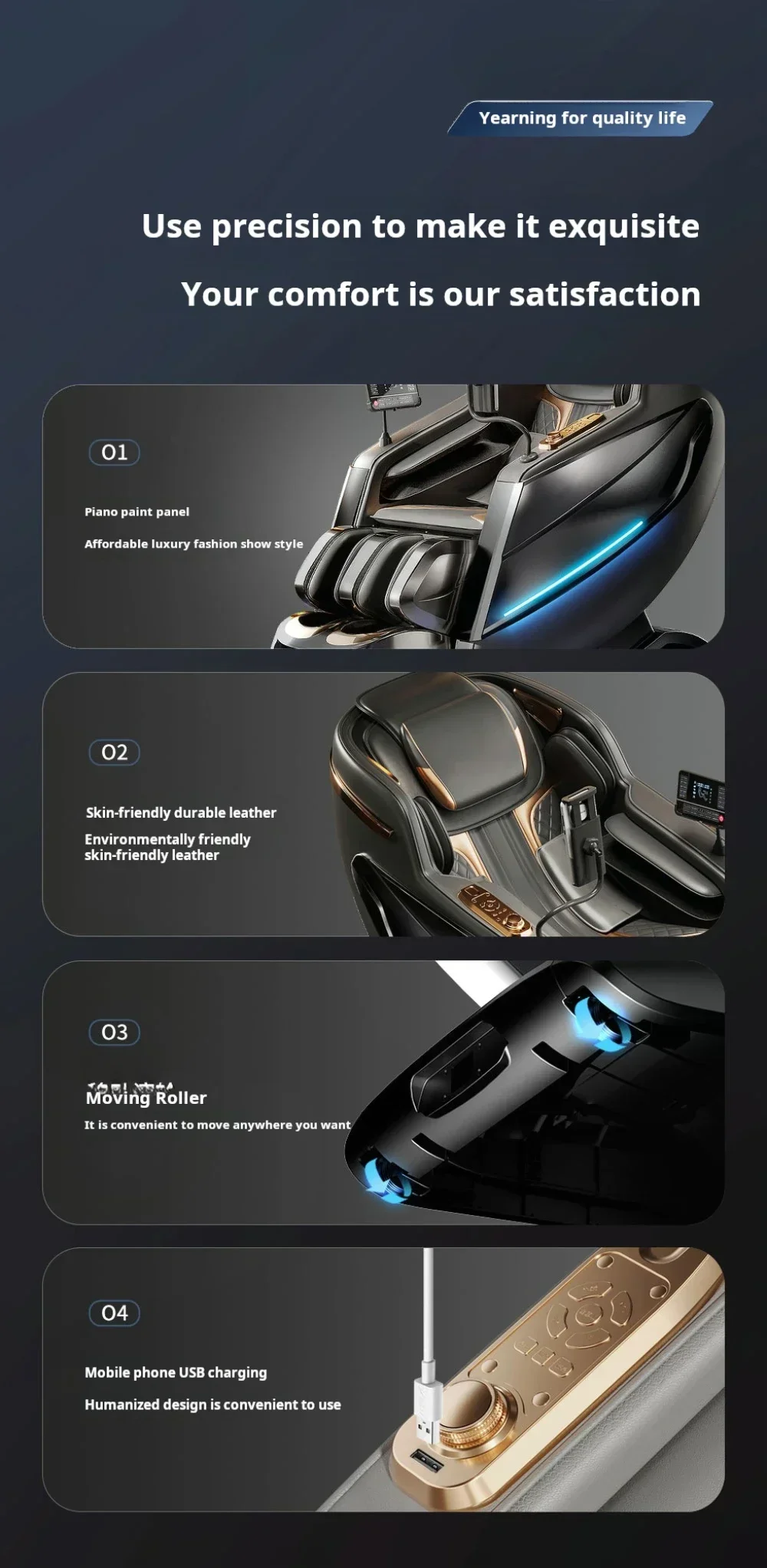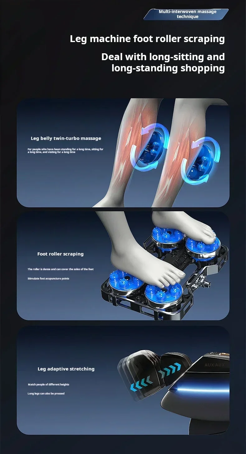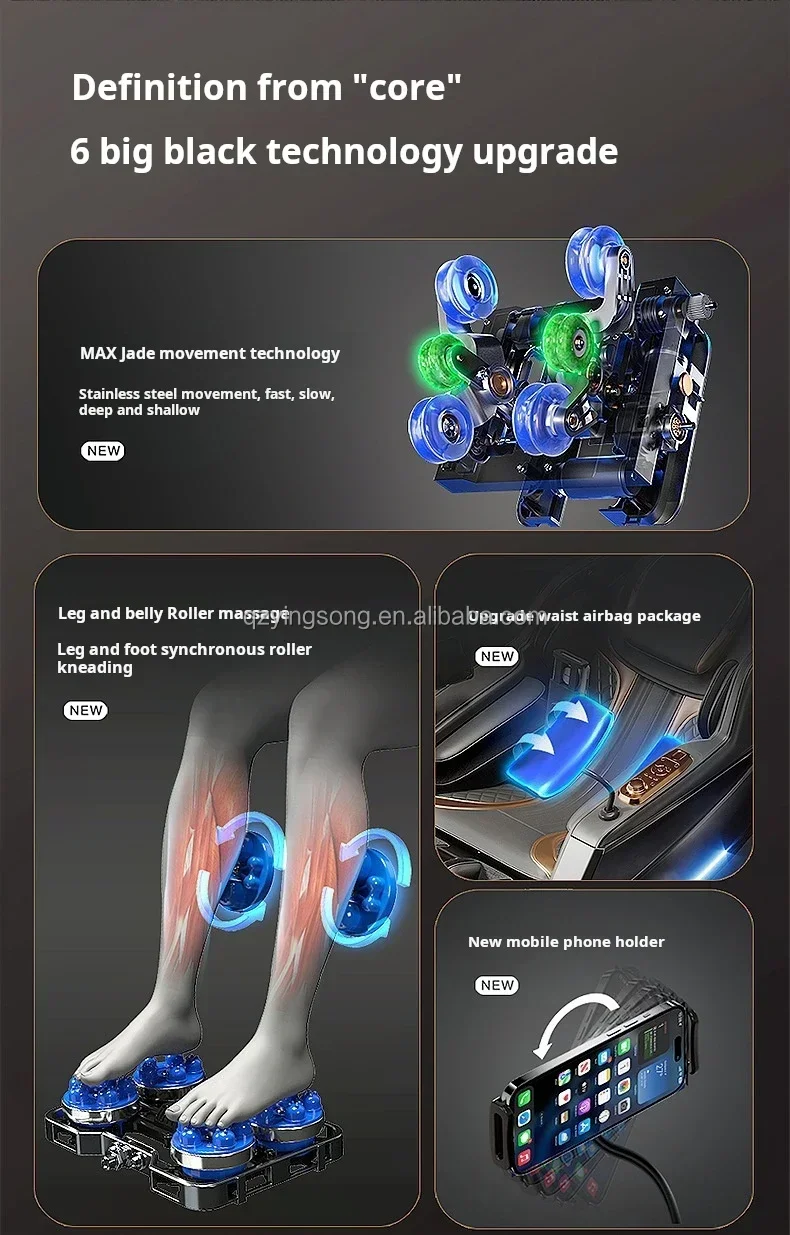 Functions | 1.Full body massage 2.SL Track, 6-point manipulator walking massage 3.LCD and fast key controllers 4.Full Body Enveloping Airbag Kneading Massage 5.Compression massage with airbag embedded in the arm. 6.High frequency vibration airbag massage for hips. 7.Foot roller massage. 8.Intelligent body detection 9.AI voice control 10.Knead, press with fingers, roll, air pressure, percussion 11.Negative oxygen ion air purification 12.Zero gravity mode 13.High Fidelity Bluetooth Music 14.Thermal back and leg massage. 15.Free stretch function for legs. 16.Calf Roller Massage 17.Thai stretching, leg machine. 18. Mobile phone holder Passage width: 78CM | ||||