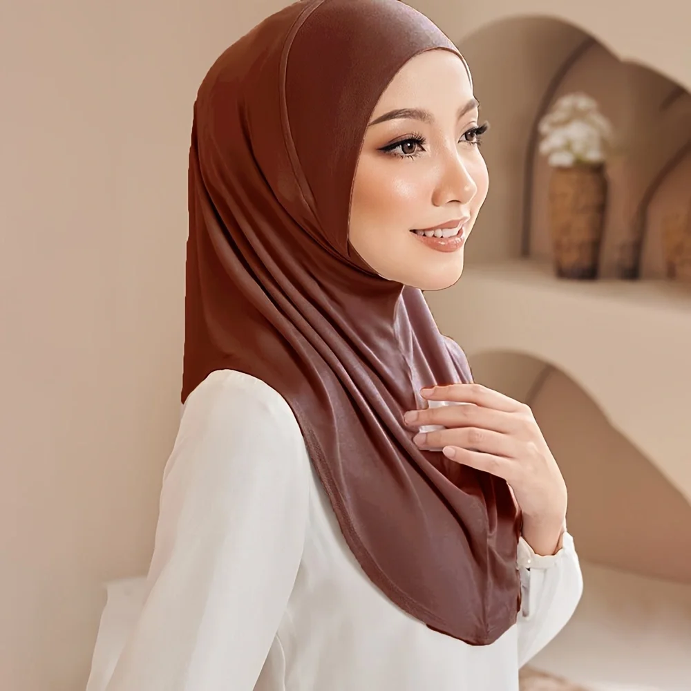 Easy to slip on for salah or good for a girl who can’t pin a hijab like me. It is flattering there’s a good amount of fabric around the neck for a cheap instant hijab and you could wear it in an outfit and look good