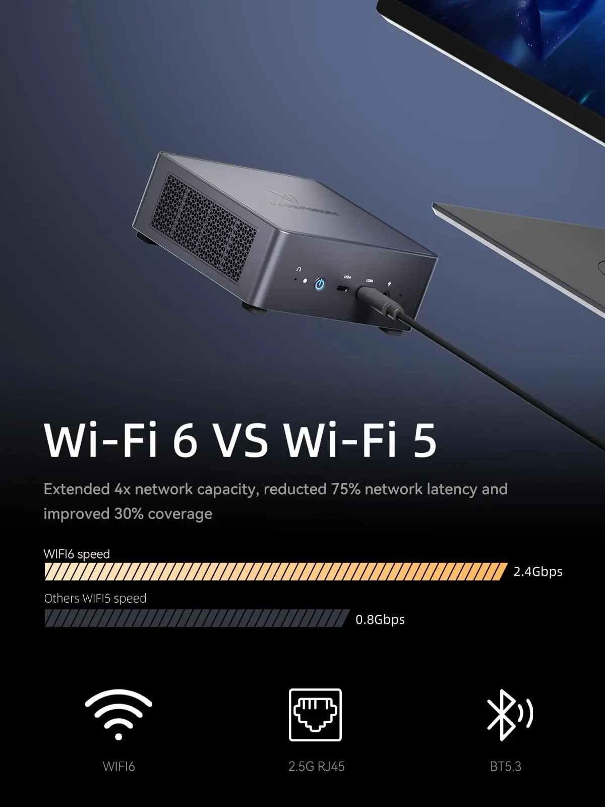 UM790 Pro comes with WIFI 6E and BT5.3, offering a dual advantage: high-speed networking and swift connectivity. With an unparalleled 2.4Gbps transfer speed, indulge in faster downloads, uploads, and streaming experiences. The extensive coverage of WIFI 6E ensures a stable connection in any environment. Meanwhile,BT5.3 provides efficient, rapid Bluetooth connections for devices. The UM790 Pro provides you with a superior network performance experience.