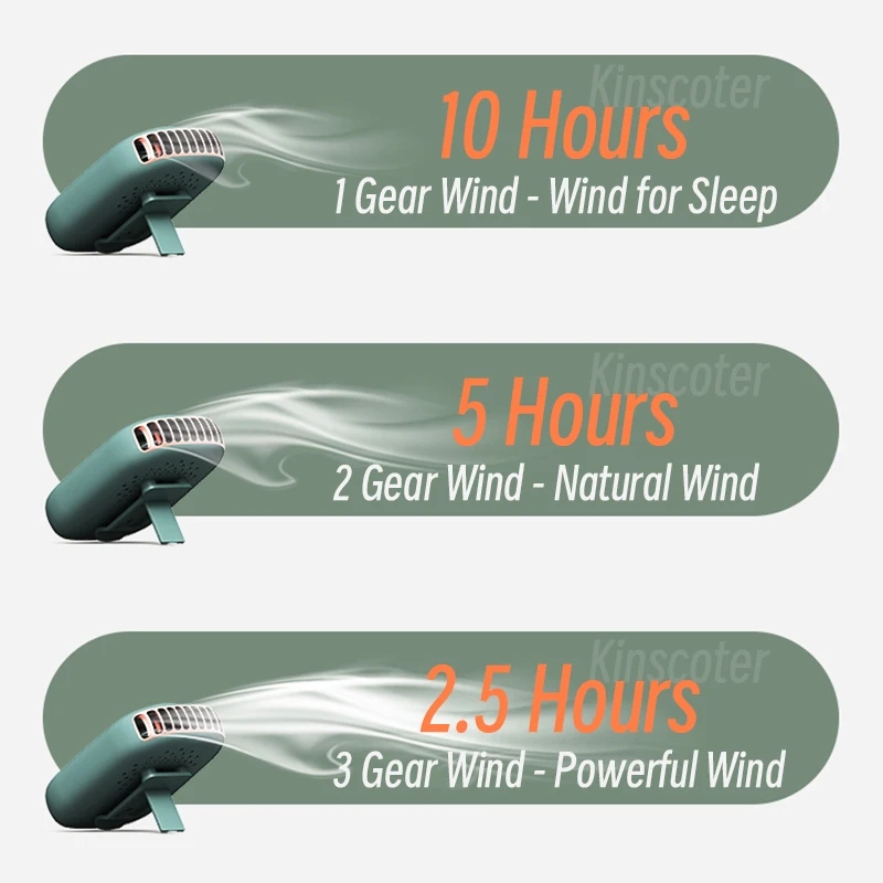 Battery life: about 10 hours for 1st gear, 4.5 hours for 2nd gear, 2.5 hours for 3rd fan