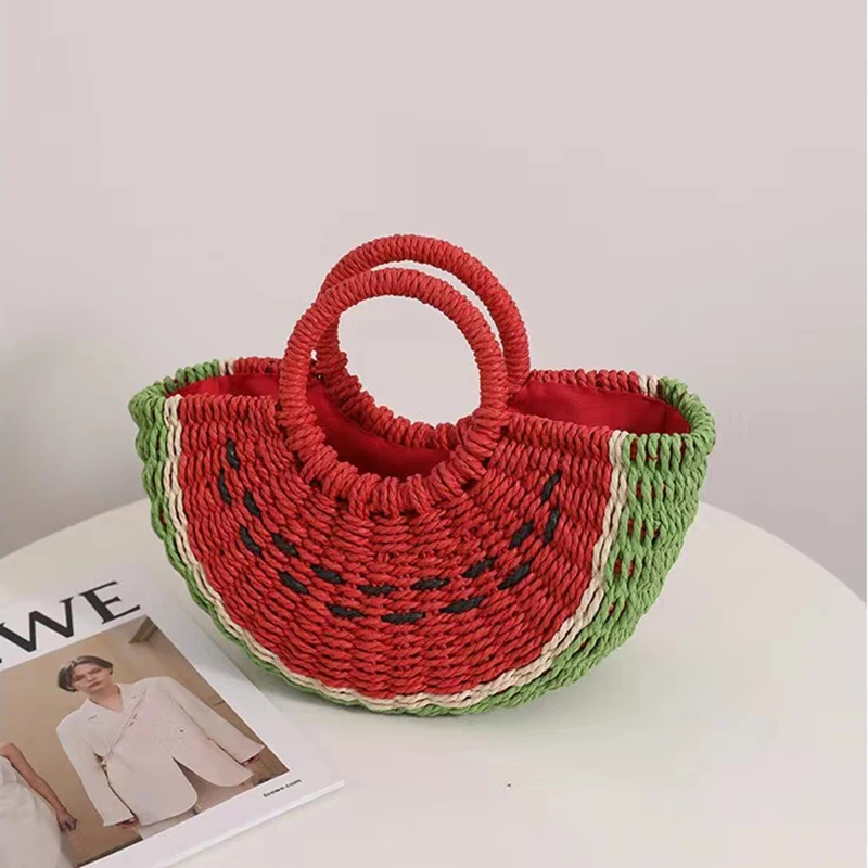 Cute Watermelon Straw Bag Candy Color Woven Bags for Women Handbag Fruit Kiwifruit Beach Bag Bohemian Crochet Travel Bags Clutch