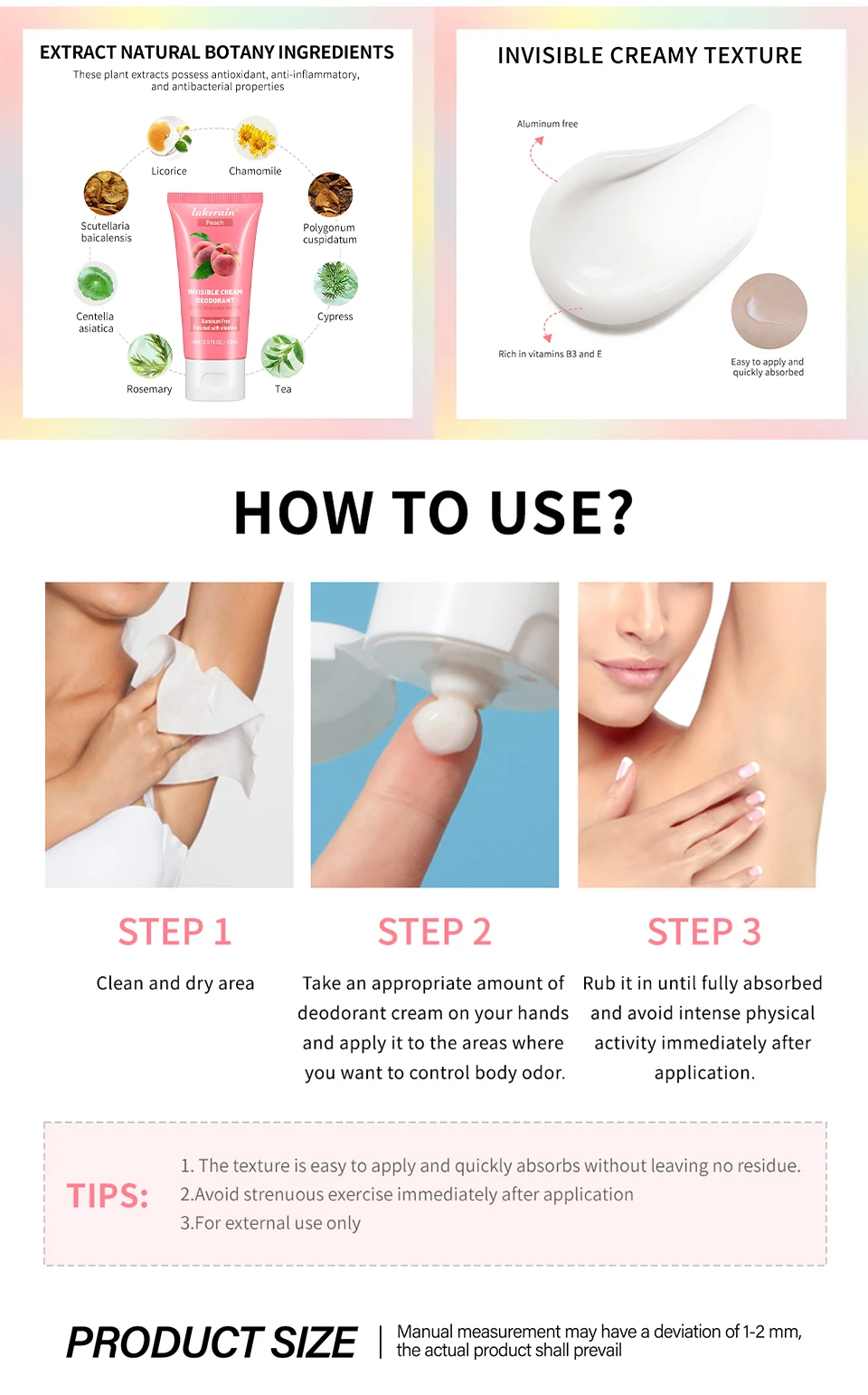 After cleansing and drying, take an appropriate amount of the deodorant cream and apply anywhere you want to control odors.