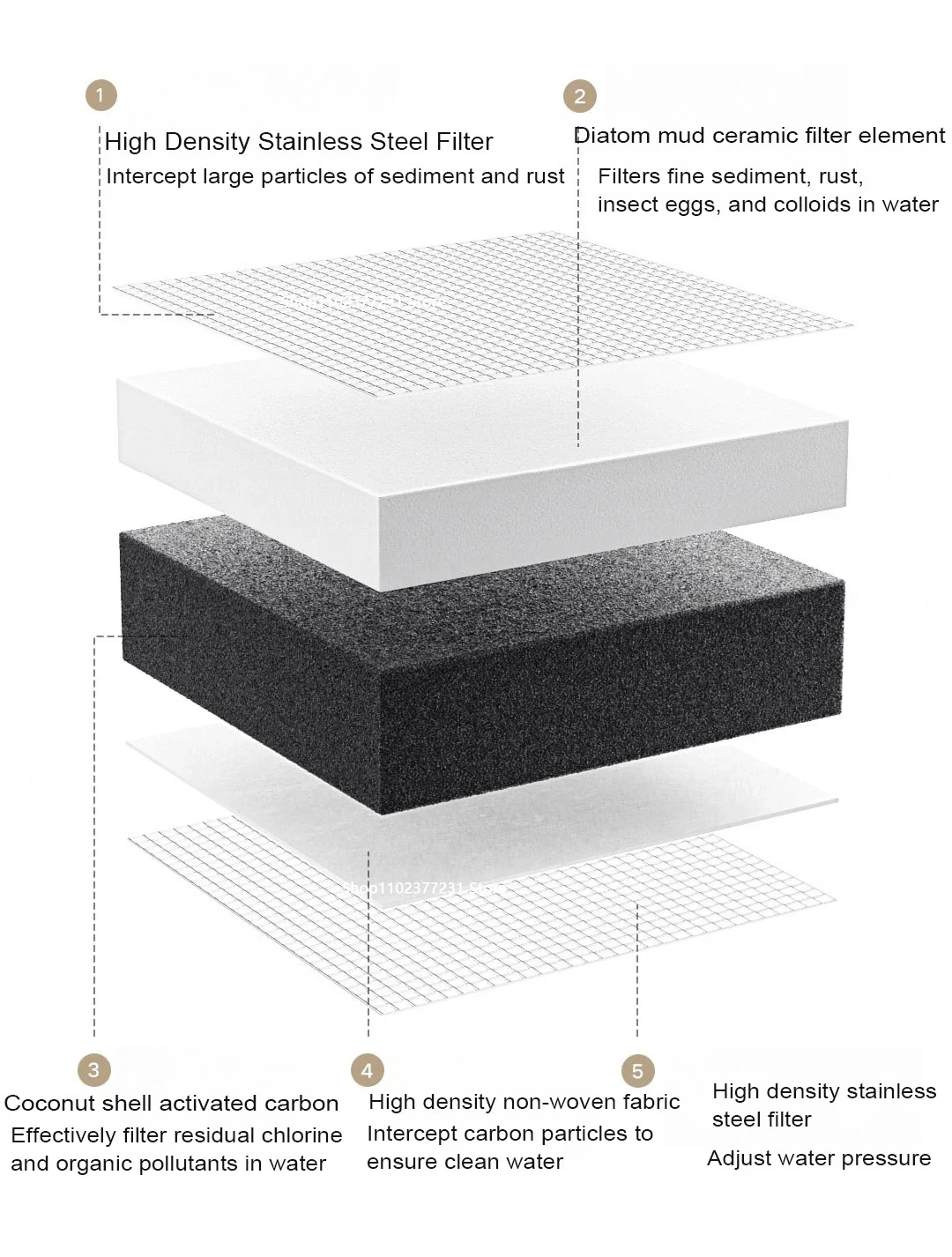 It adopts a 5-layer composite filtration system, with layer-by-layer filtration and deep purification, which effectively removes sediment, rust, insect eggs, colloids, residual chlorine and organic pollutants* in the water, filtering out healthy and good water.