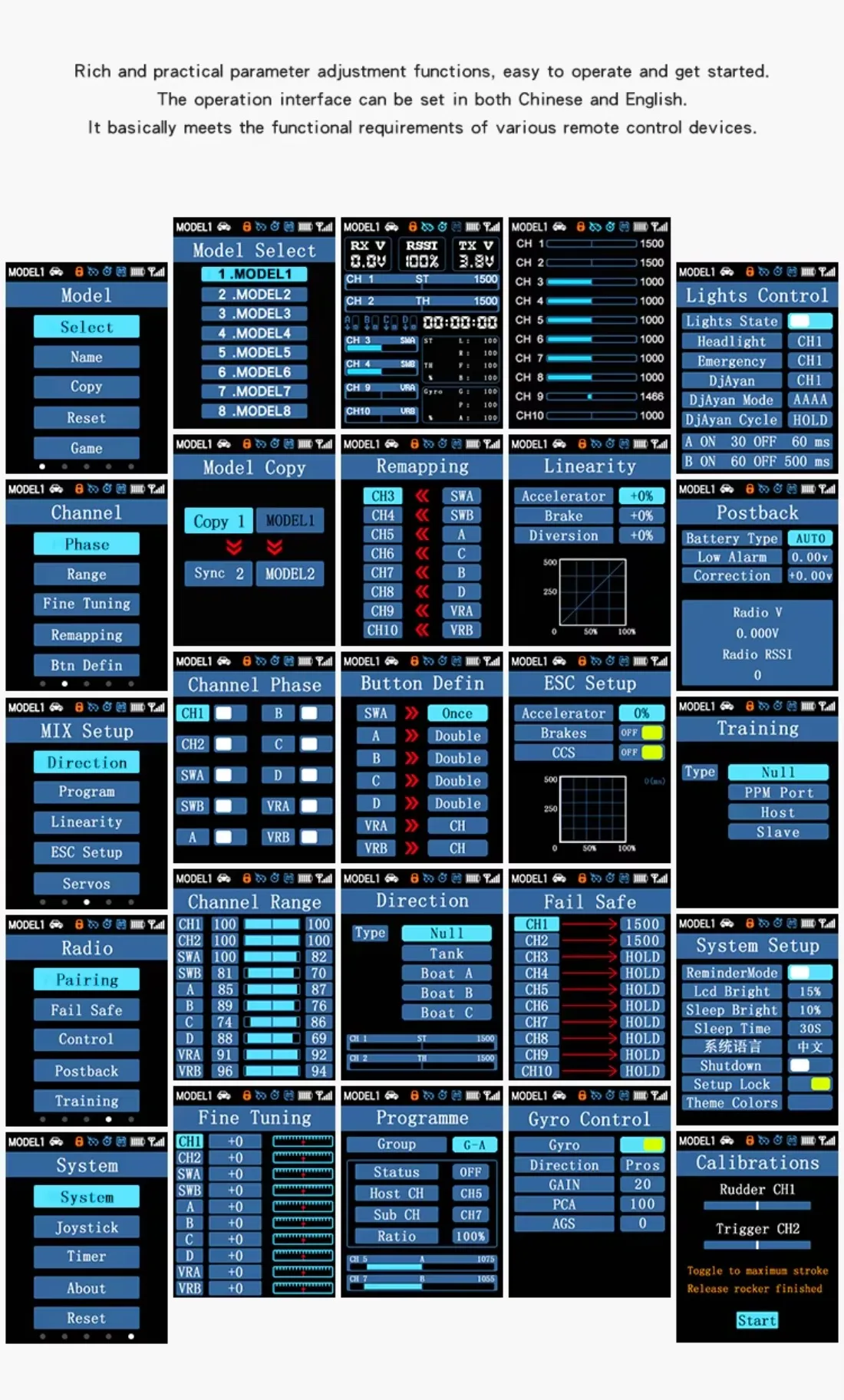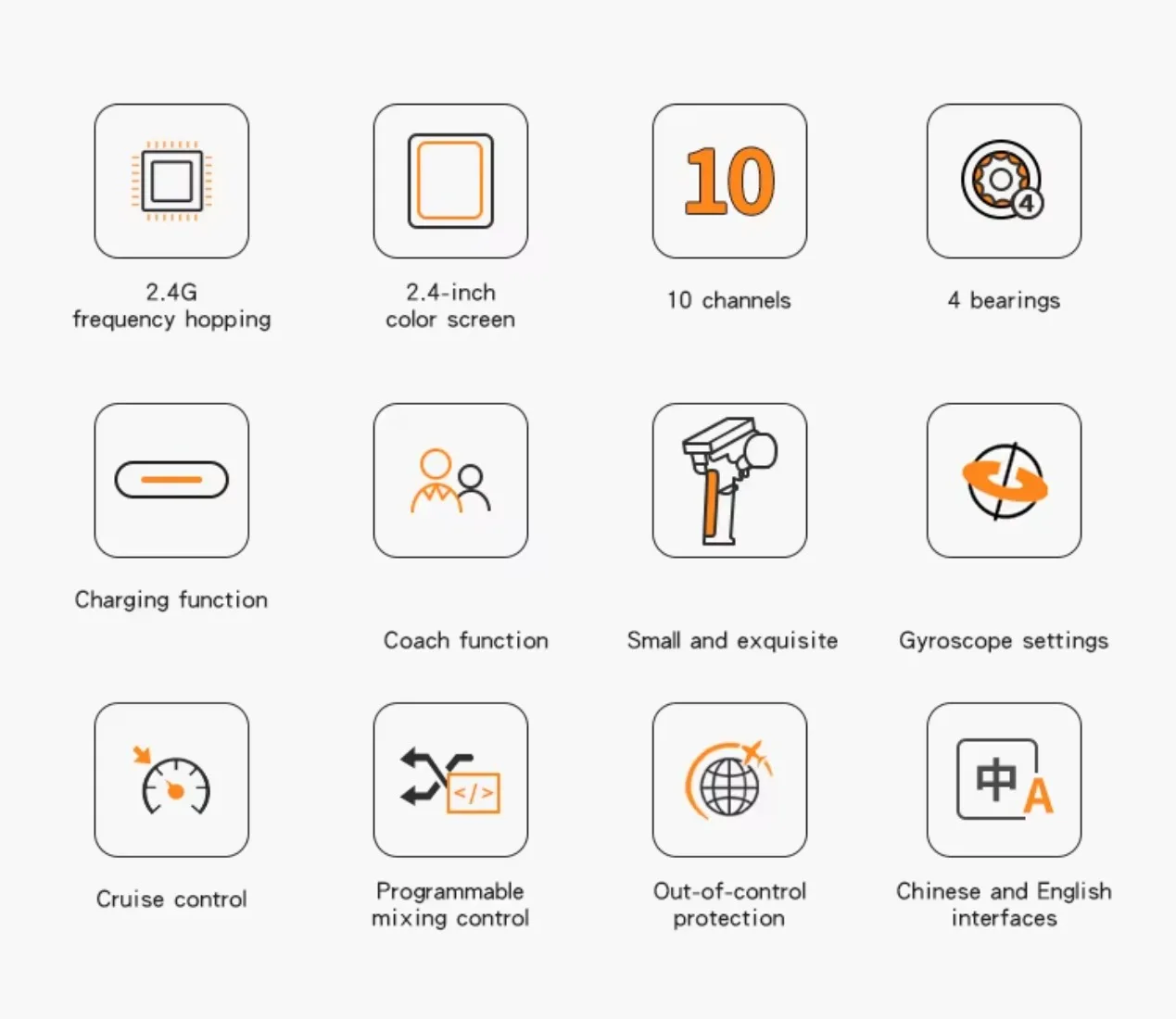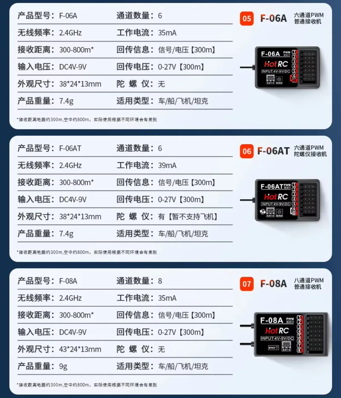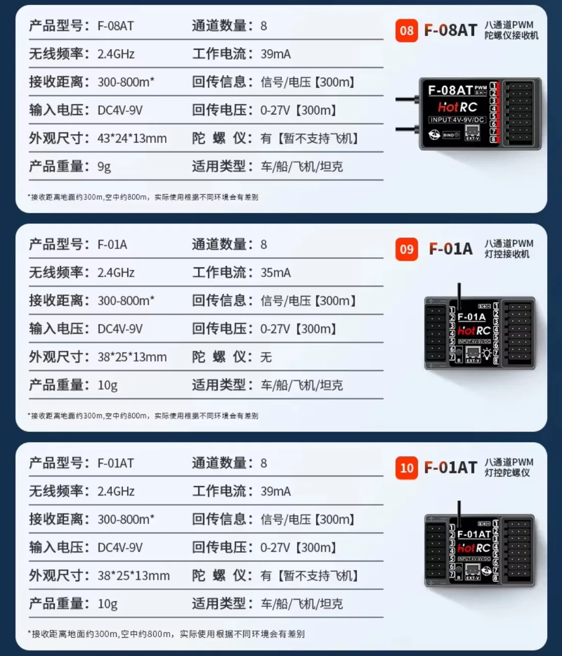 2. F-04AT, F-06AT, F-08AT, F-01AT receivers have built-in gyroscopes to ensure that the model moves in a straight line and prevent tail swinging and rollover. The gyroscope function does not support aircraft models ;