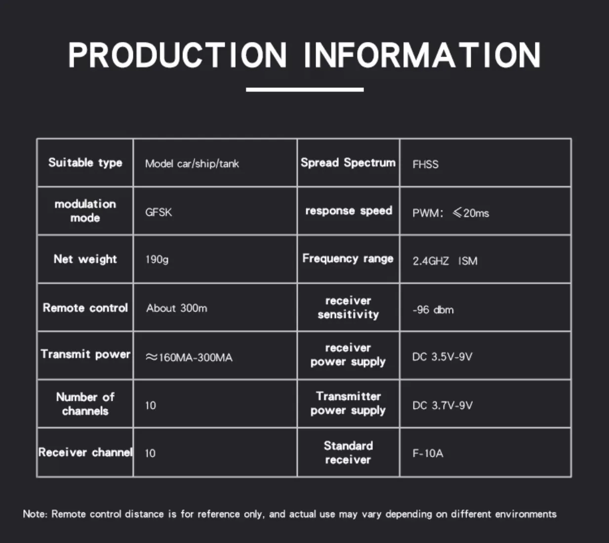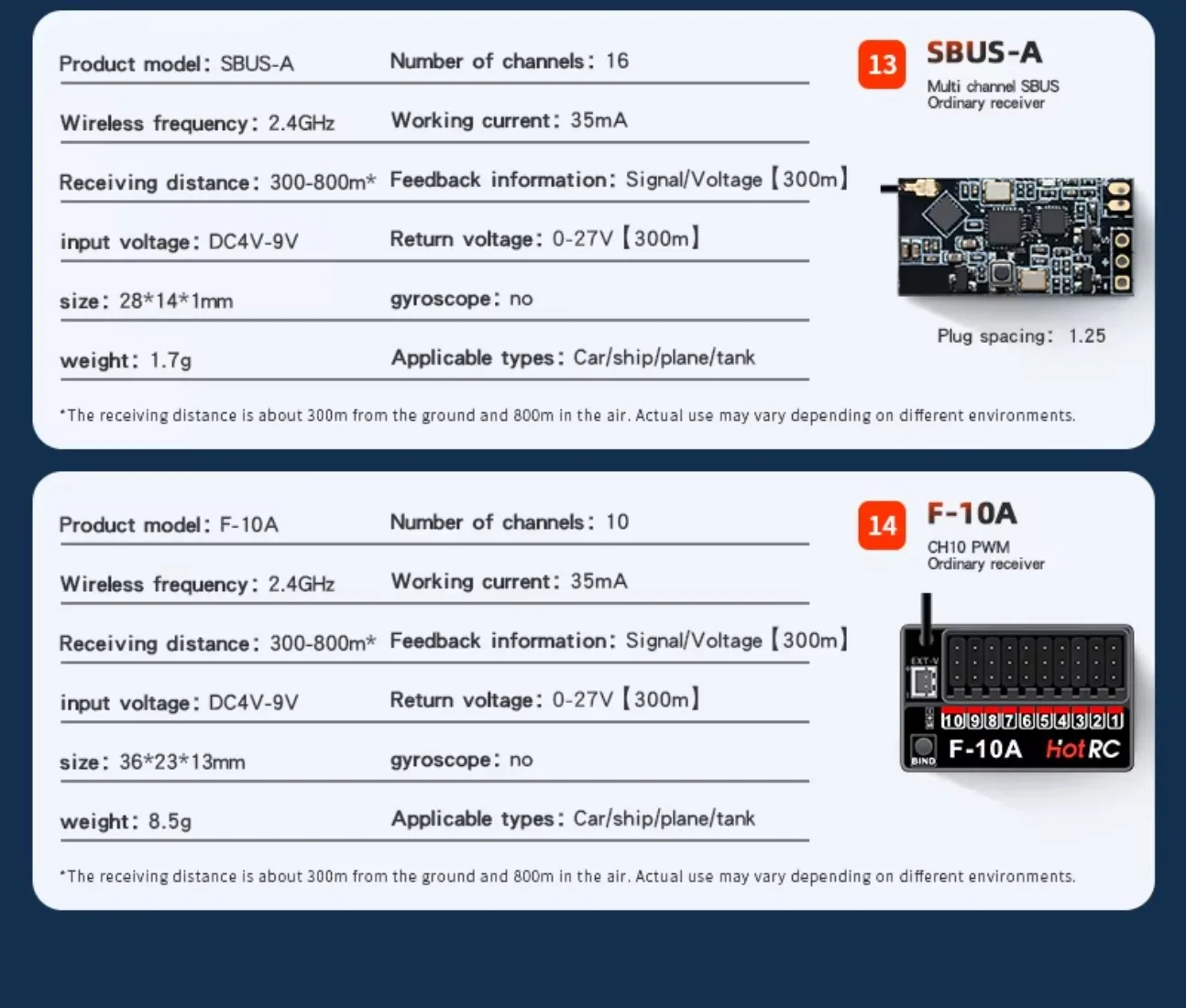 5. The receiver receiving distance is 300-800m, about 300m on the ground and about 800m in the air. The actual use will vary according to different environments ;