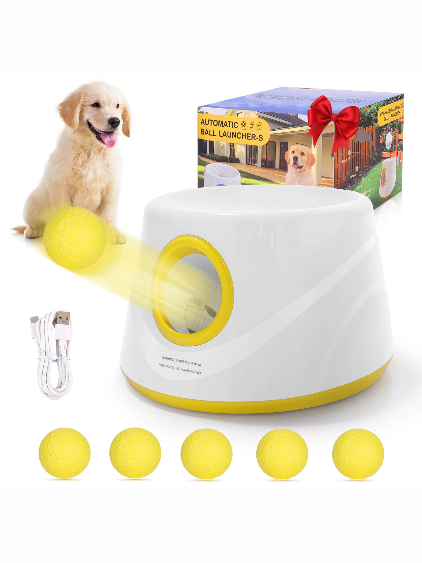 3 ball launching modes.. short, medium and long for outdoor use.. with the short mode it can be used indoors. My maltipoo has a lot of fun. Charging cable included and 5 balls 🥎 included. Truly a good product.