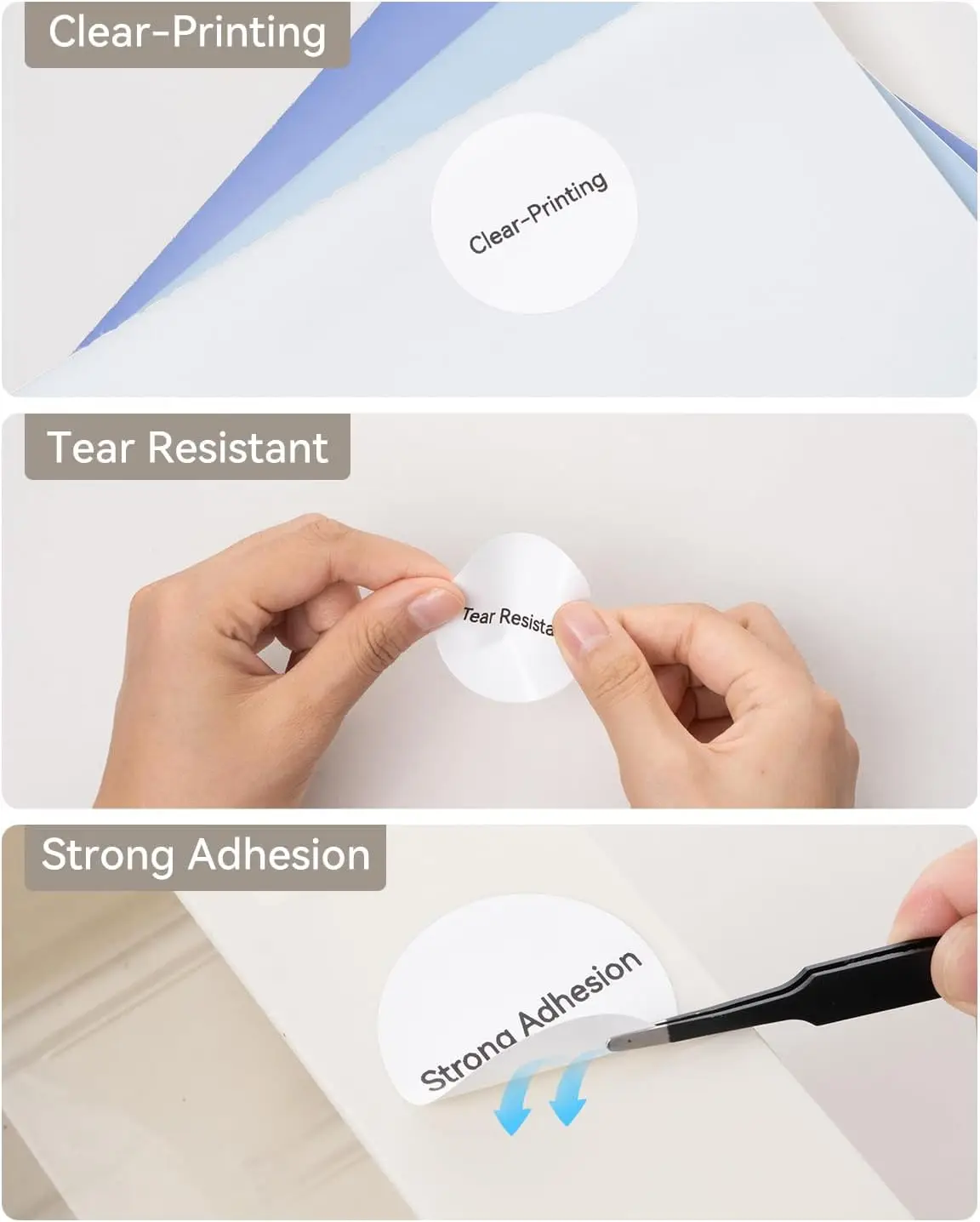 – Label paper characteristics: waterproof, oil-proof, scratch-proof, tear-proof, no glue