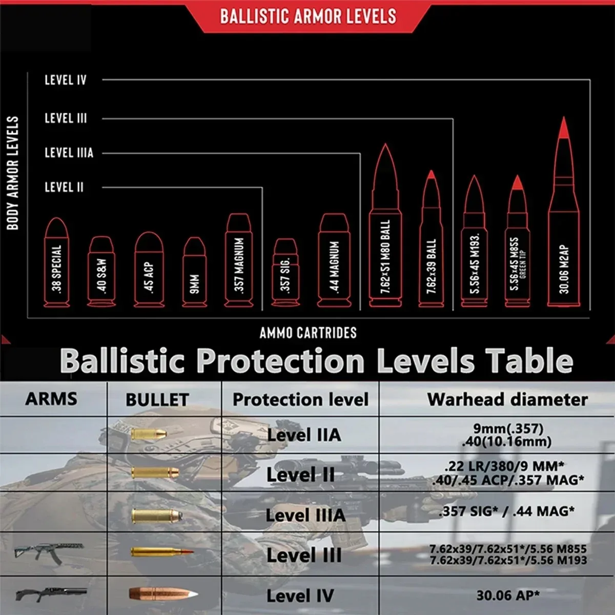 Protection against:9mm FMJ RN 1400 Fps (428m/s).357 SIG FMJ FN 1470 Fps (448m/s).44 Mag SJHP 1430 Fps (436m/s)
