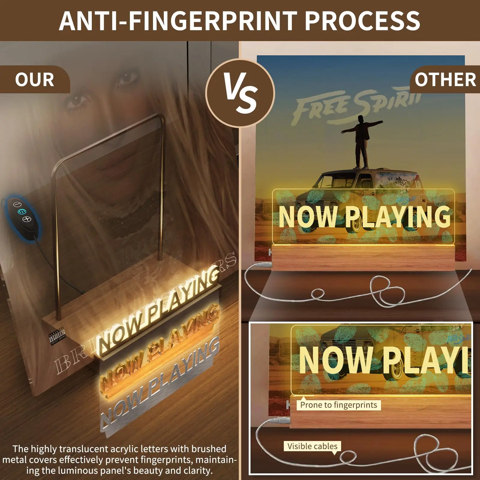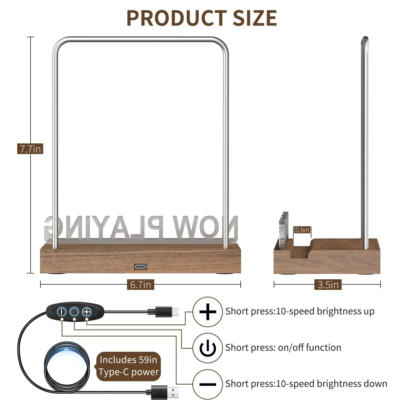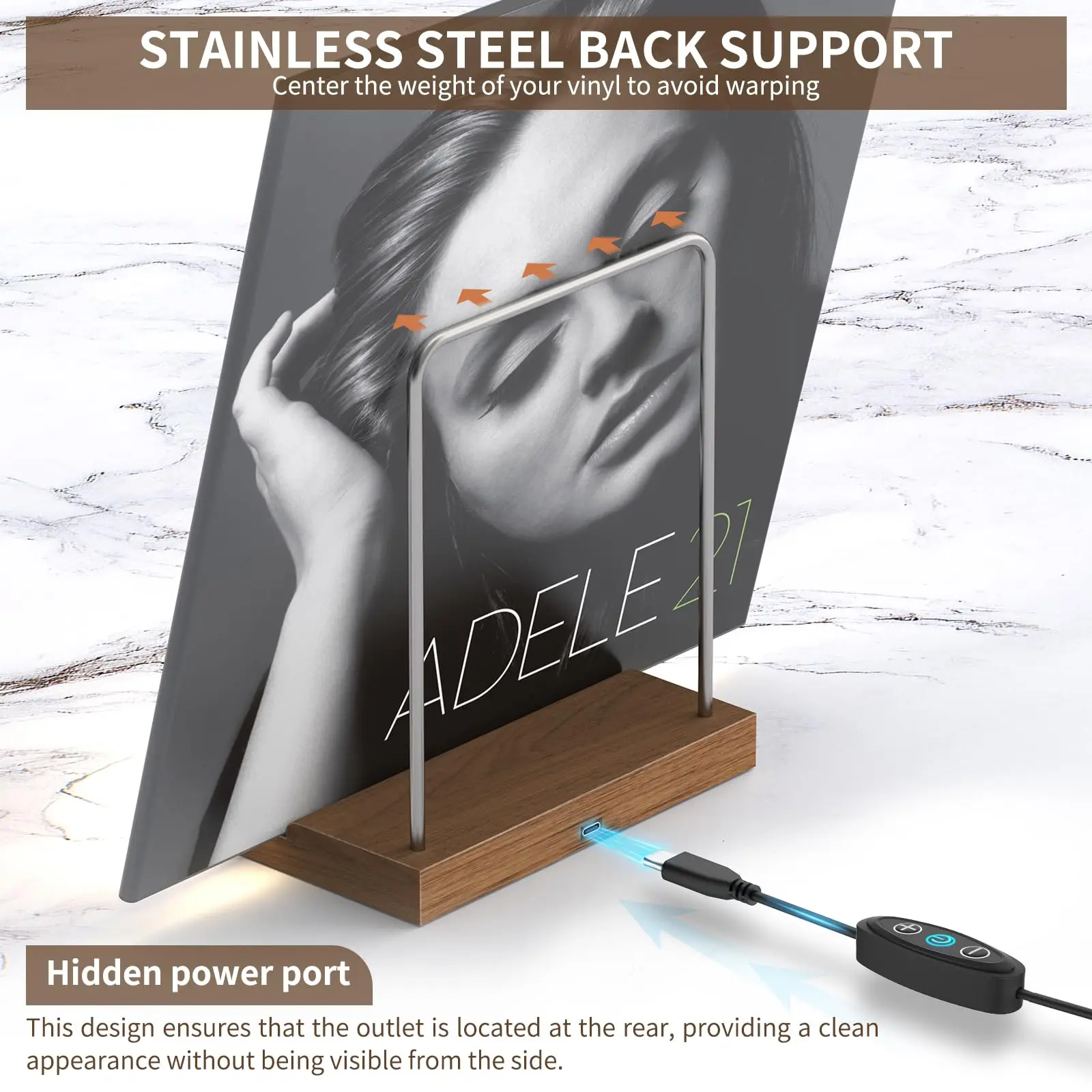 · 【Unique Design】Our Light up Now Spinning Record Stand features a Type-C outlet on the back of the wood base, powered by a USB cable, This design makes the power cable and outlet invisible from the front, and there is an on/off switch on the cable to control the light. The highly translucent acrylic letters with brushed metal covers effectively prevent the acrylic from fingerprints, dirts and scratches.