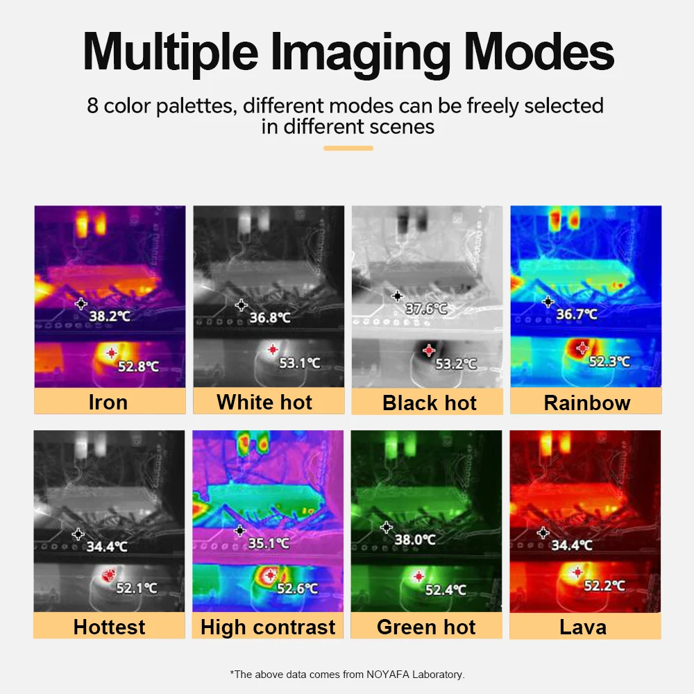 2. 8 COLOR PALETTES:  Iron Red, White Hot, Black Hot, Rainbow, Red Hot, High Contrast, Green Hot, and Lava.