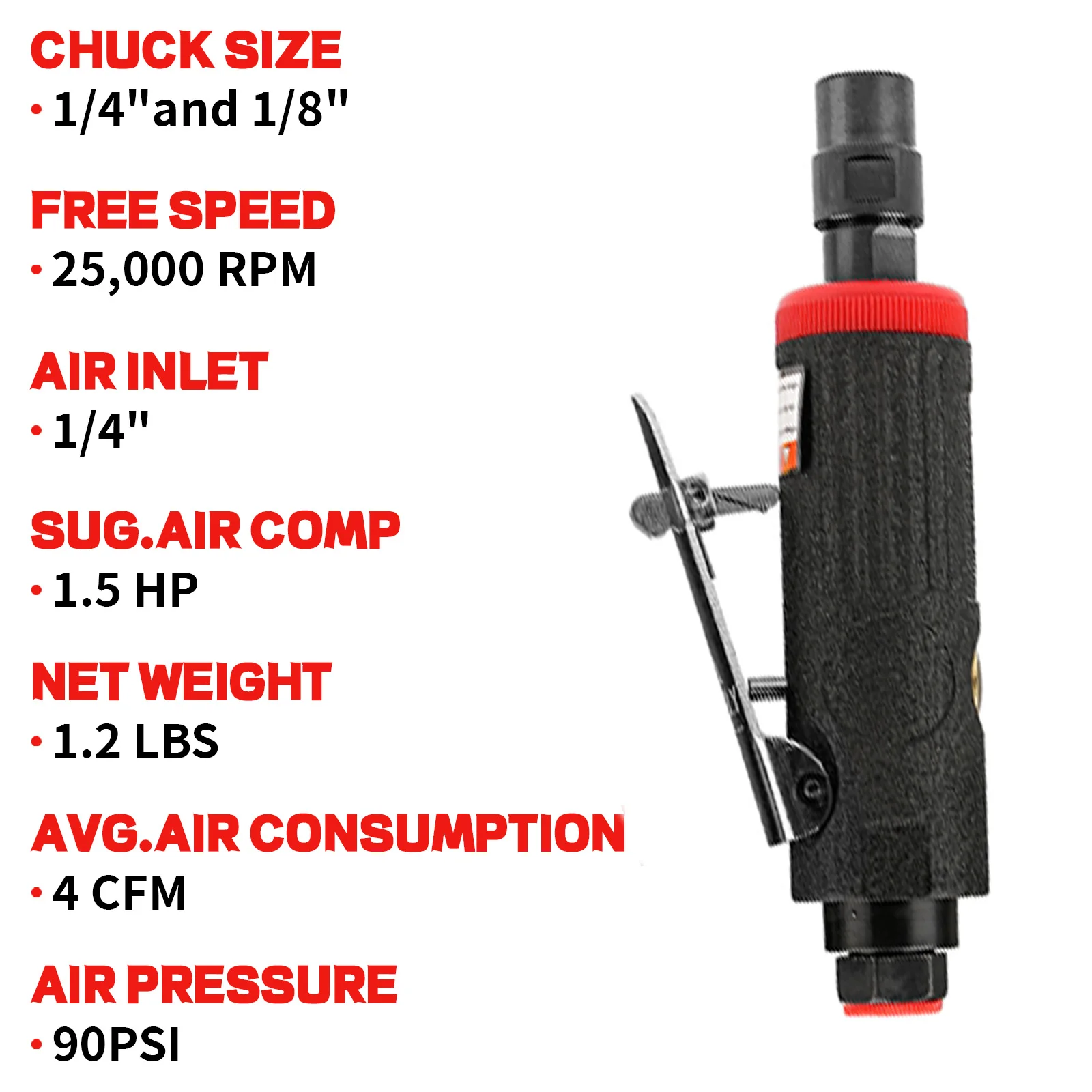 — 1/4" straight head air die grinder with 1/4" and 1/8" chucks, small body air tool ideal for narrow Narrow spaces that cannot be reached by tilt grinders