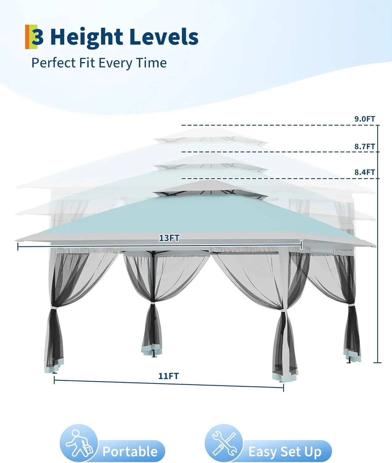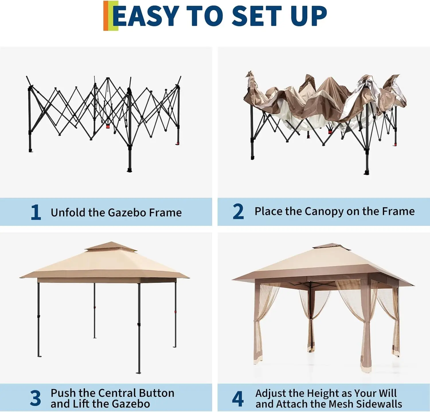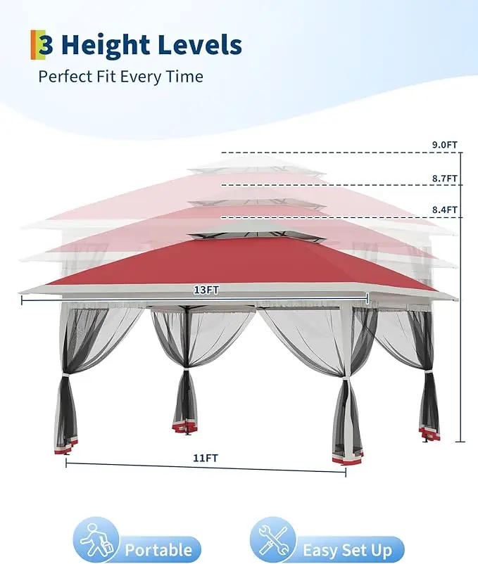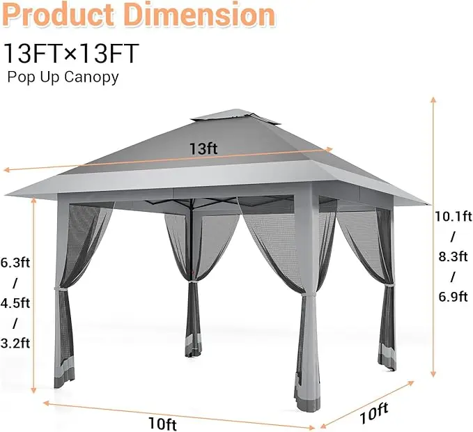 【3-Level Adjustable Height】Featuring a 3-position adjustable height system, this gazebo canopy can be easily customized to fit different occasions. Whether used for patio shade, garden parties, or outdoor markets, it adapts to your needs.