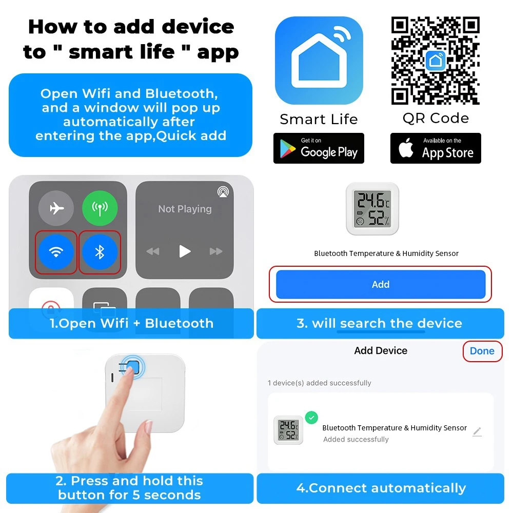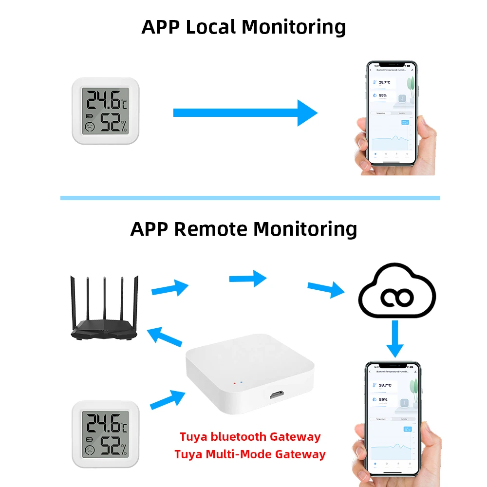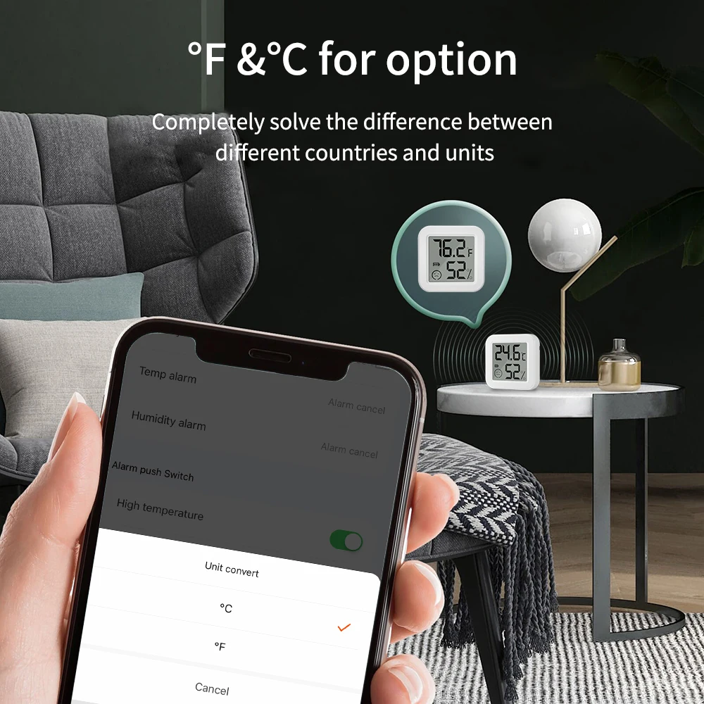 Through Bluetooth gateway, the temperature & humidity sensor can be linked with other smart devices, and you can check the temperature and humidity anytime and anywhere.(The following functions must be work with bluetooth gateway)