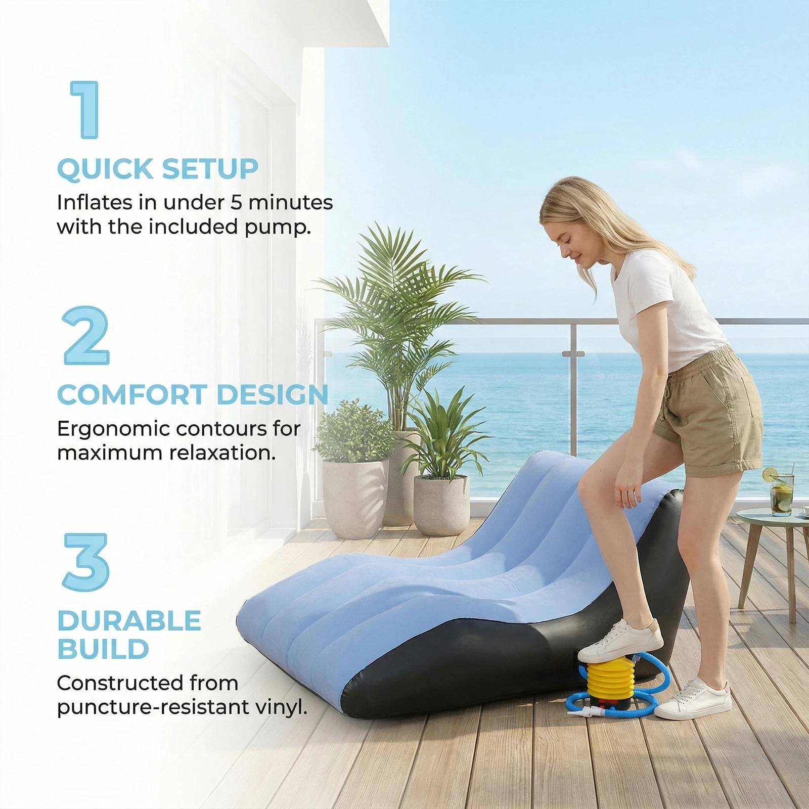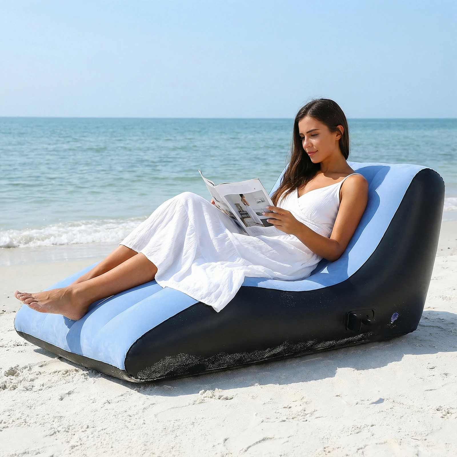 4.Versatile Stylish Appeal: This inflatable chair features a modern design that complements any decor. Whether in the living room or patio, it adapts seamlessly to gatherings, sunbathing, or unwinding after a long day, adding a touch of elegance.