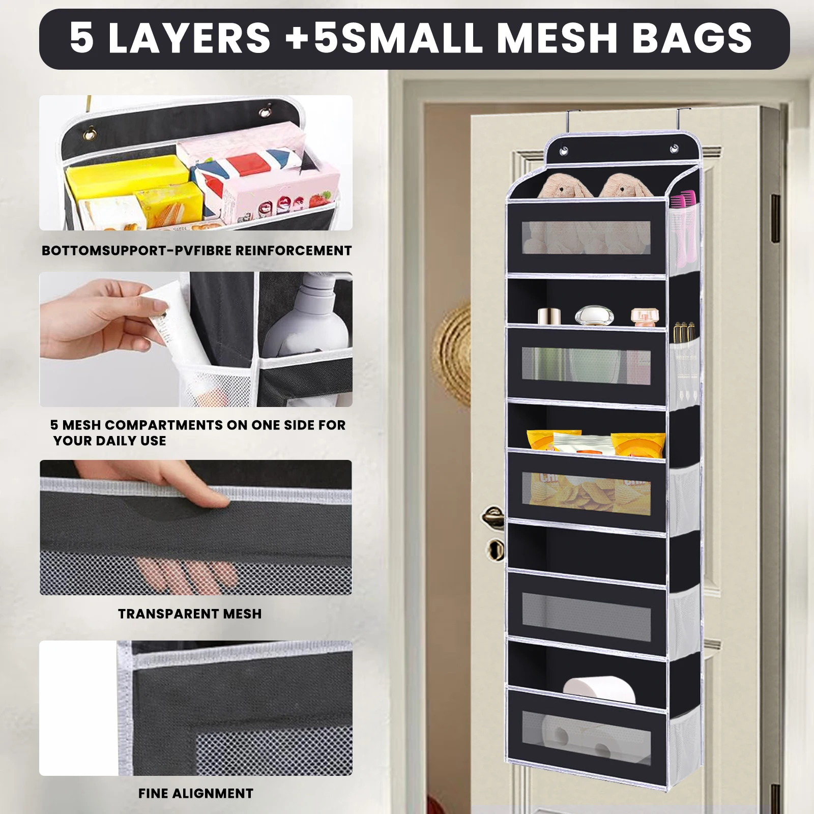 Simple Installation and Tool-Free – This upgraded over door organizer features 2 sturdy metal hooks and reinforced support, ensuring your items stay securely in place without tilting. Designed to fit most doors without hindering their closing, it's an ideal solution for closet organizers and storage, making room organization a breeze.