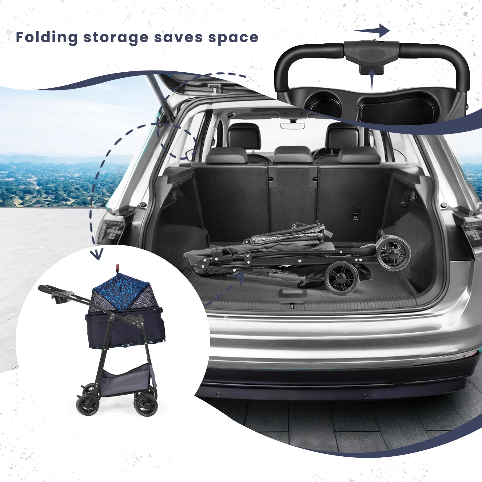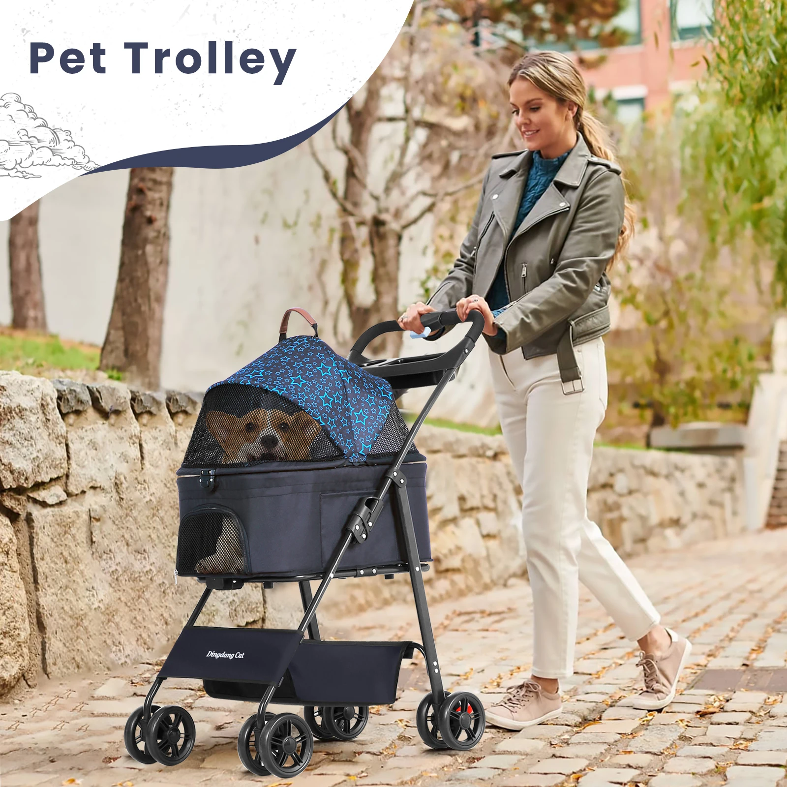 Lightweight and portable: This pet stroller features a foldable design, making it convenient for walking and travelling with your furry companion.