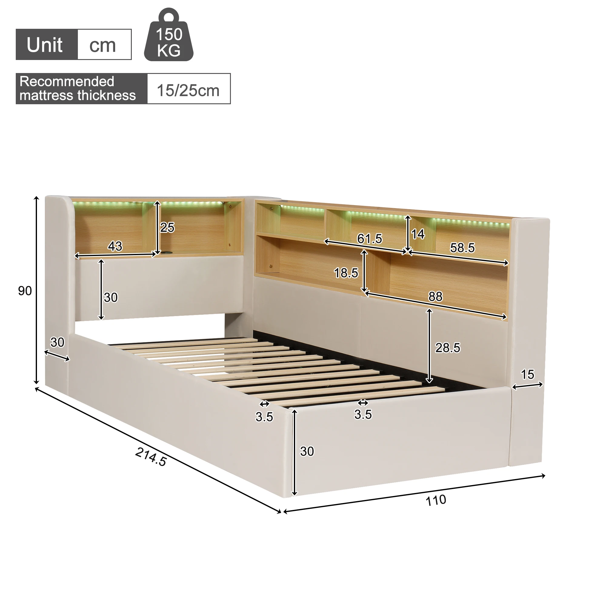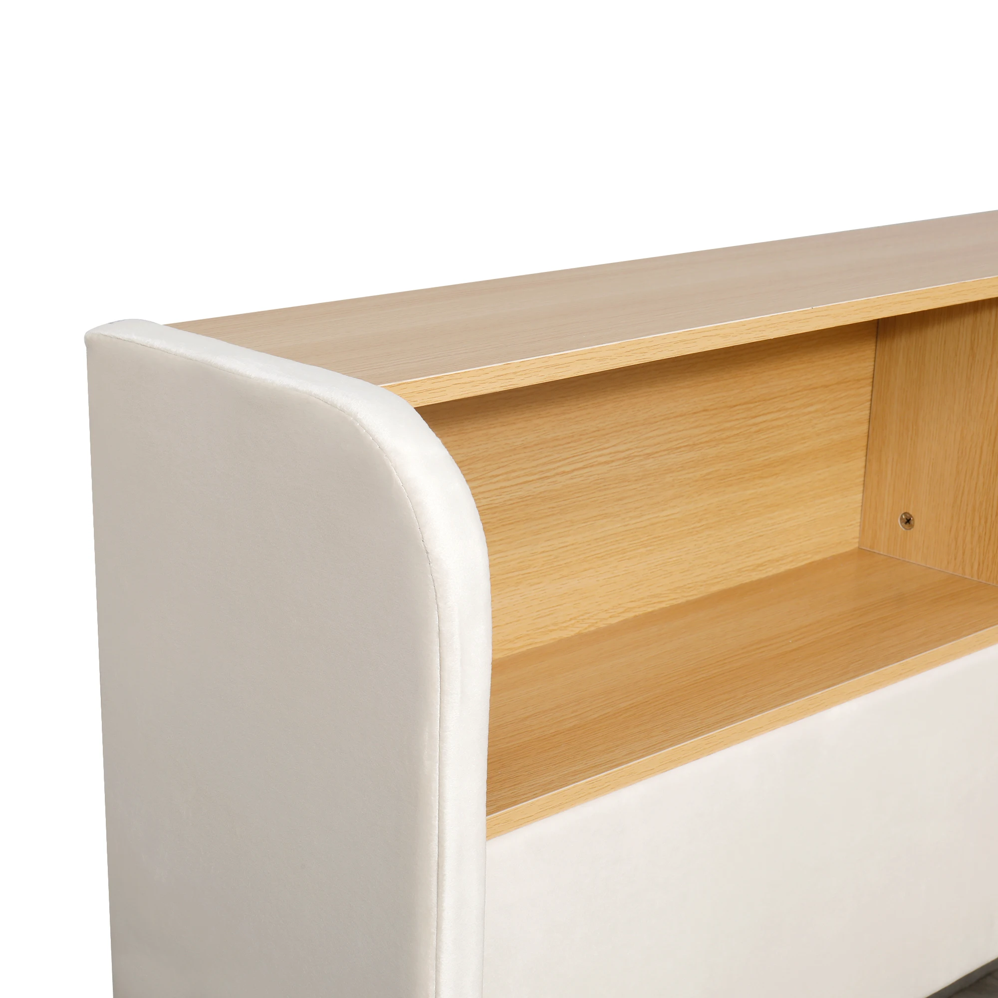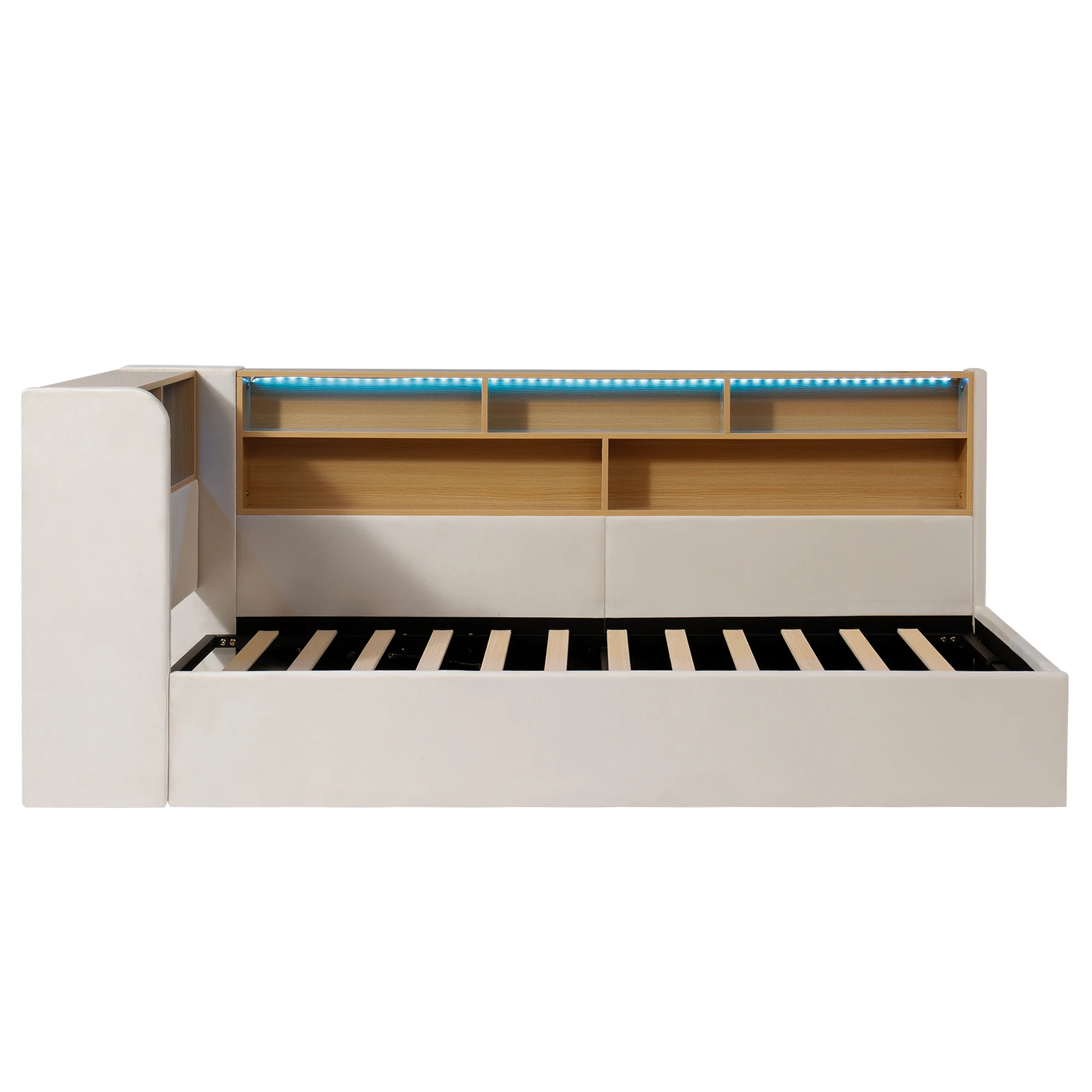 Flexible layout at the headboard and sides: Not only does the headboard feature open shelves for bedtime stories, alarm clocks, and favorite toys, but the sides also cleverly incorporate storage shelves for snacks, water bottles, and frequently used items. This encourages children to keep their little world organized.
