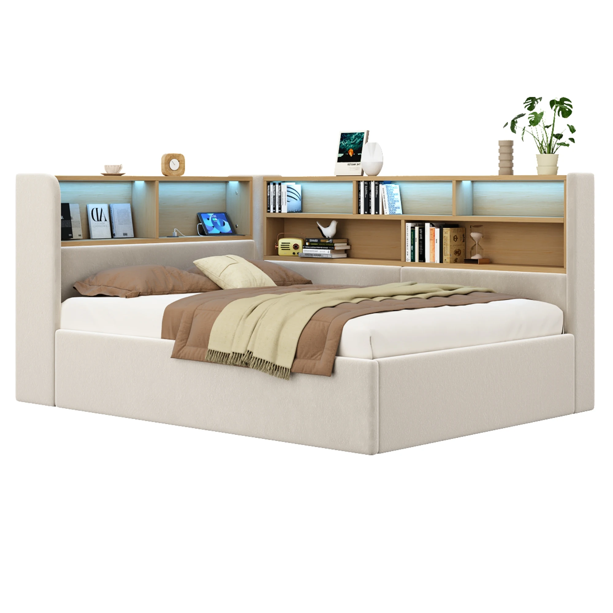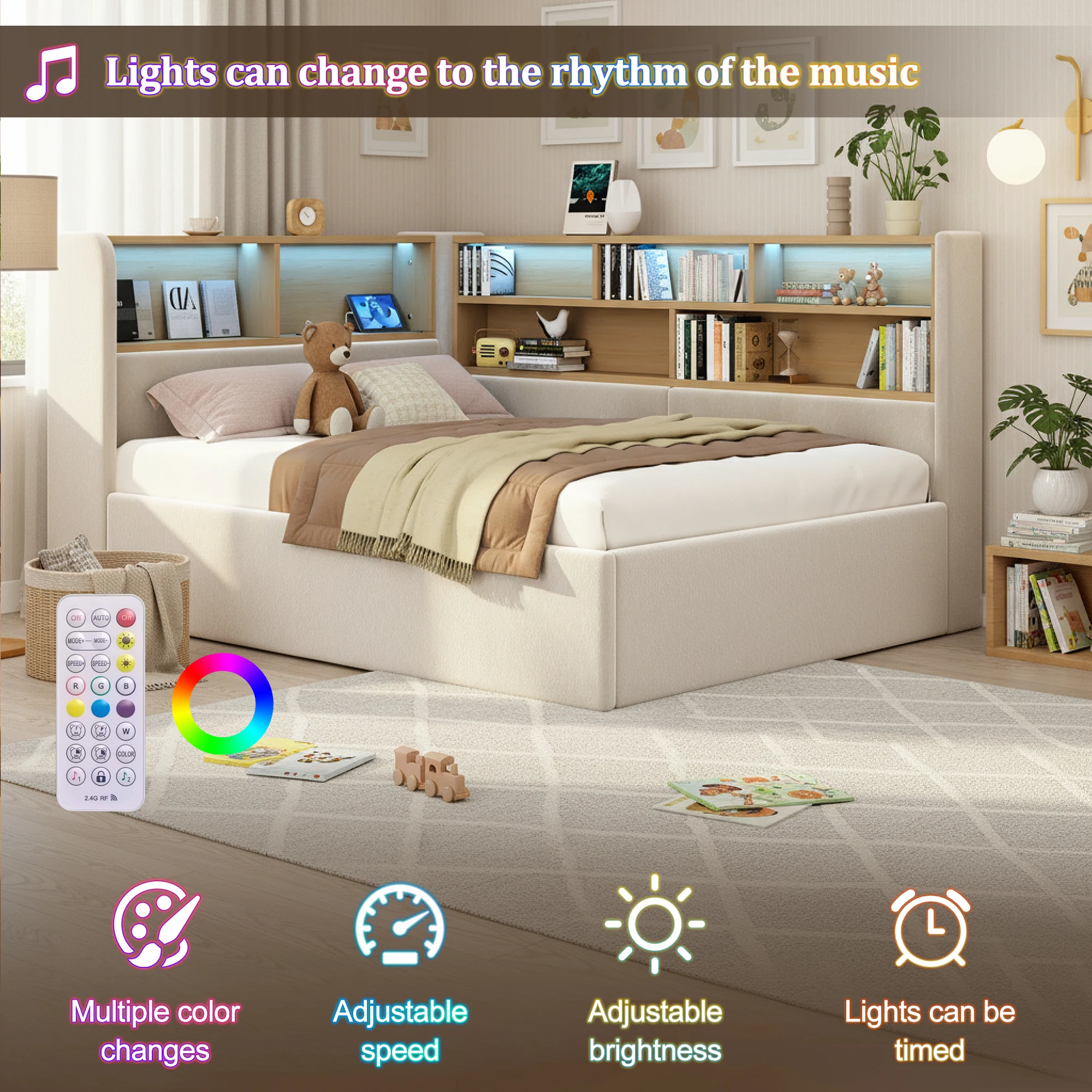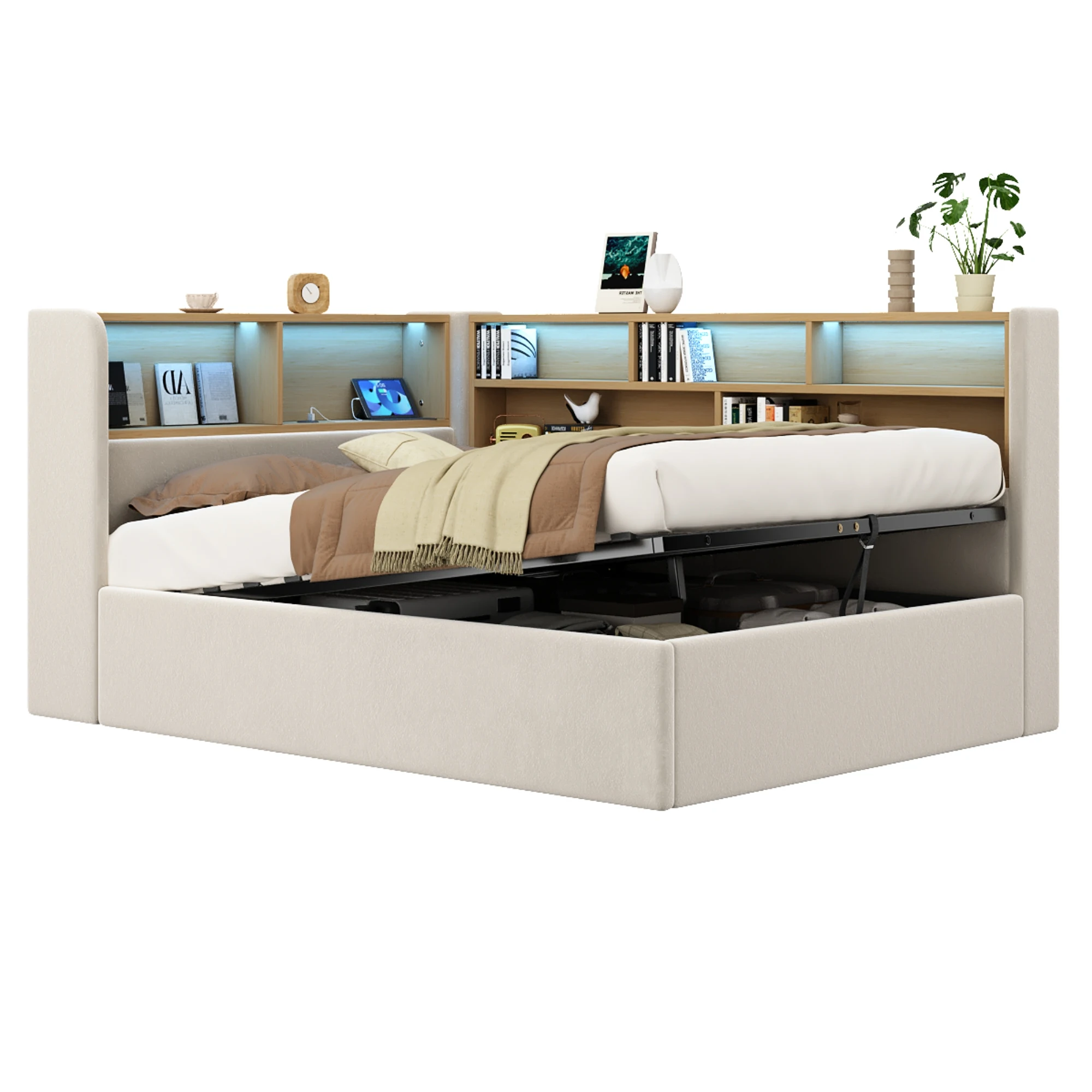 Soft, ambient LED light strips provide warm, non-glaring illumination, creating a perfect ambiance. High-quality LED light strips are embedded in the headboard and sides, diffusing light through multiple layers for a warm and even glow, suitable as a night light, reading light, or ambient light. It supports control via app or remote. The headboard also features dual charging ports (USB + Type-C), eliminating the hassle of searching for outlets.