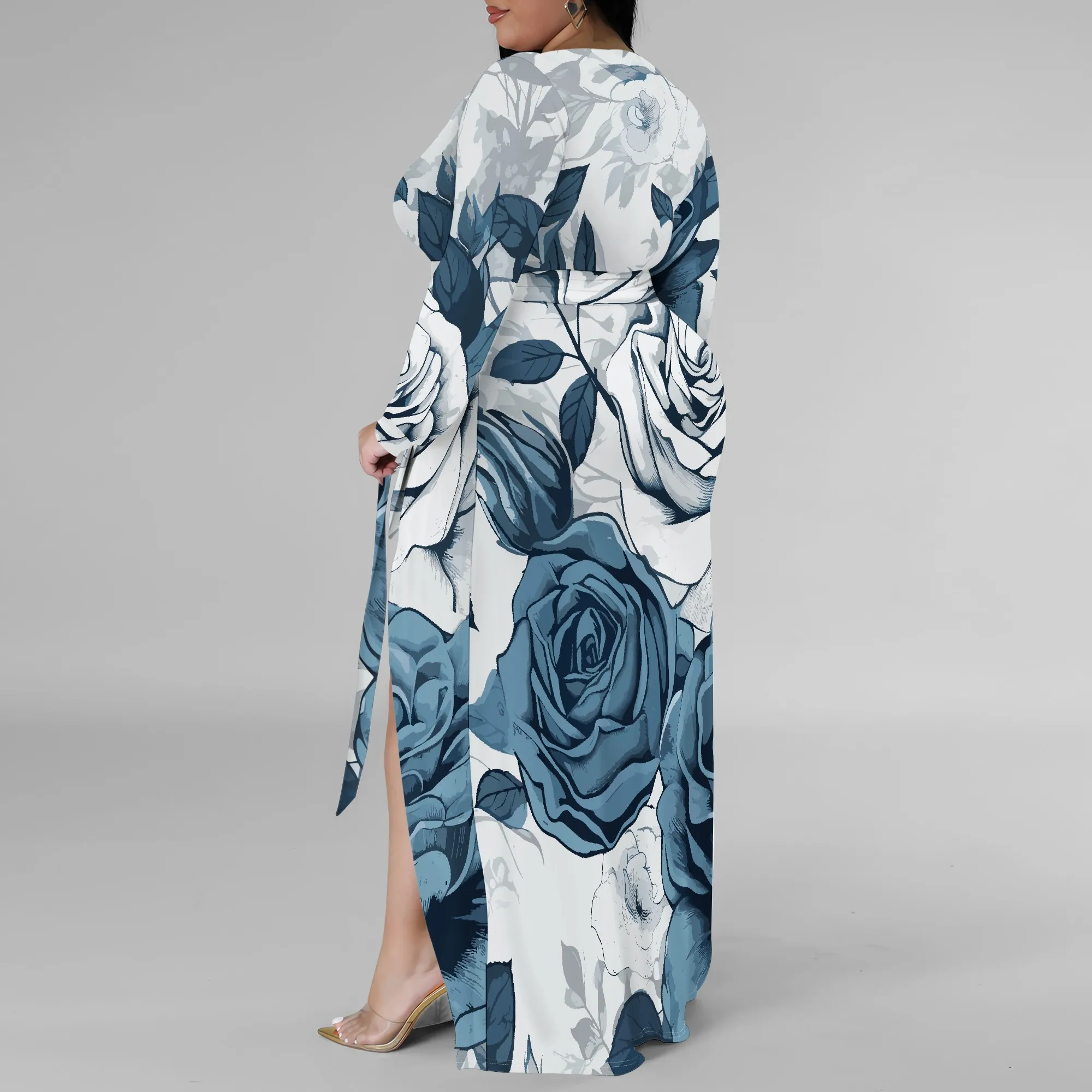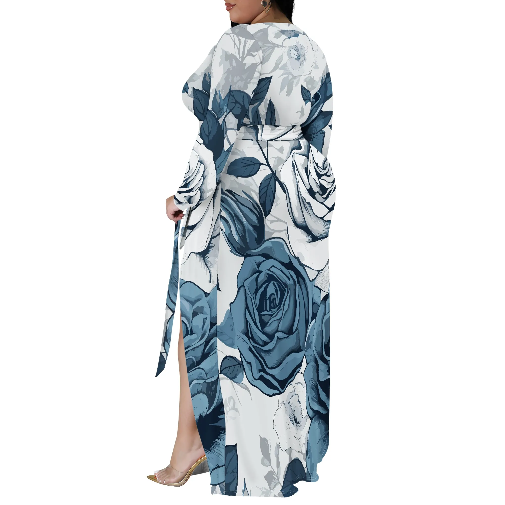 Plus Size Long Sleeve Blue Rose Print Wrap Maxi Dress for Women, Elegant Dress with Side Slit for Special Occasions