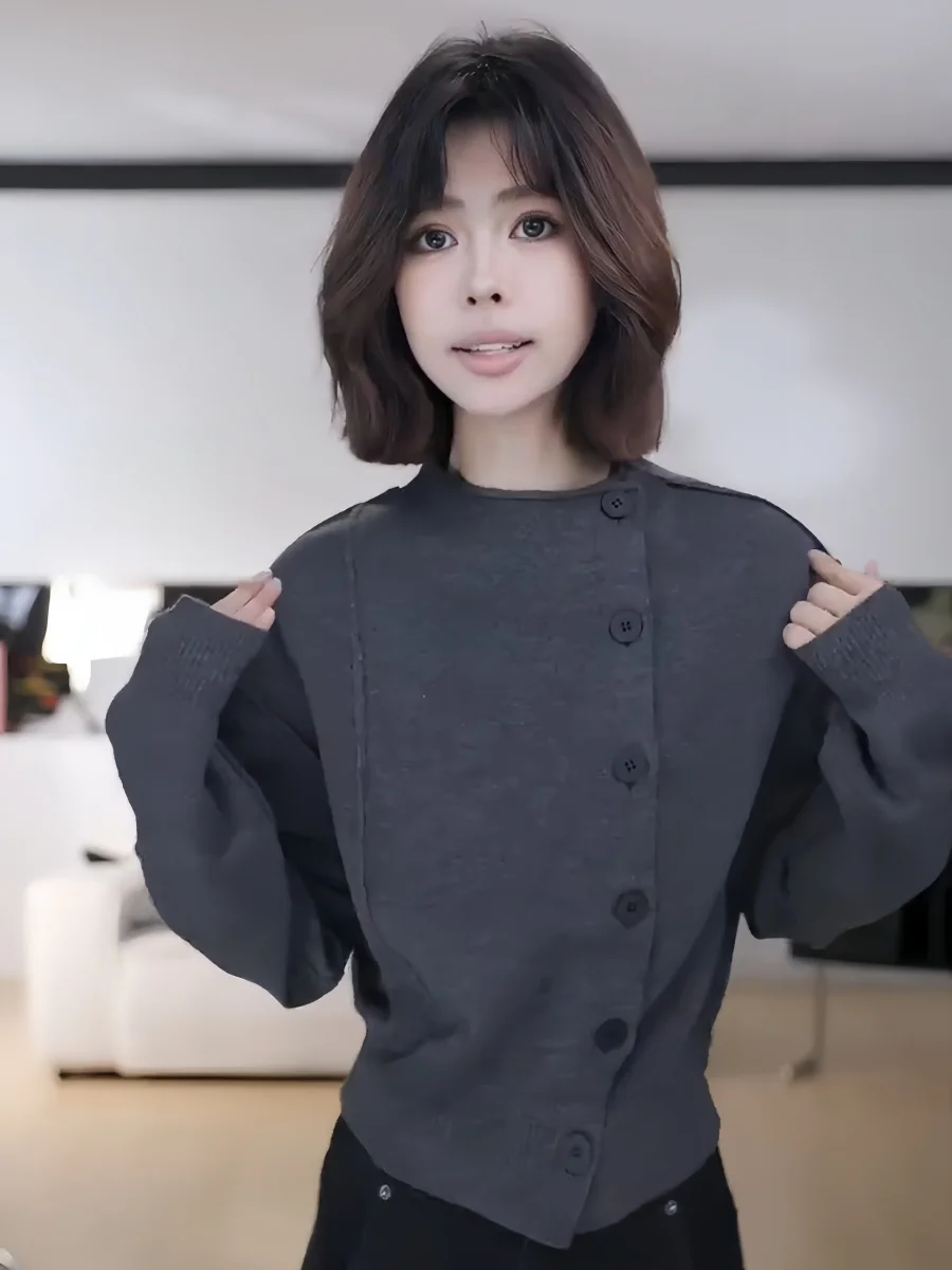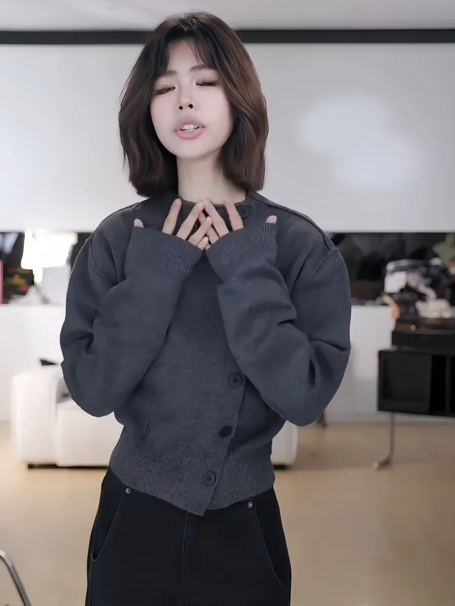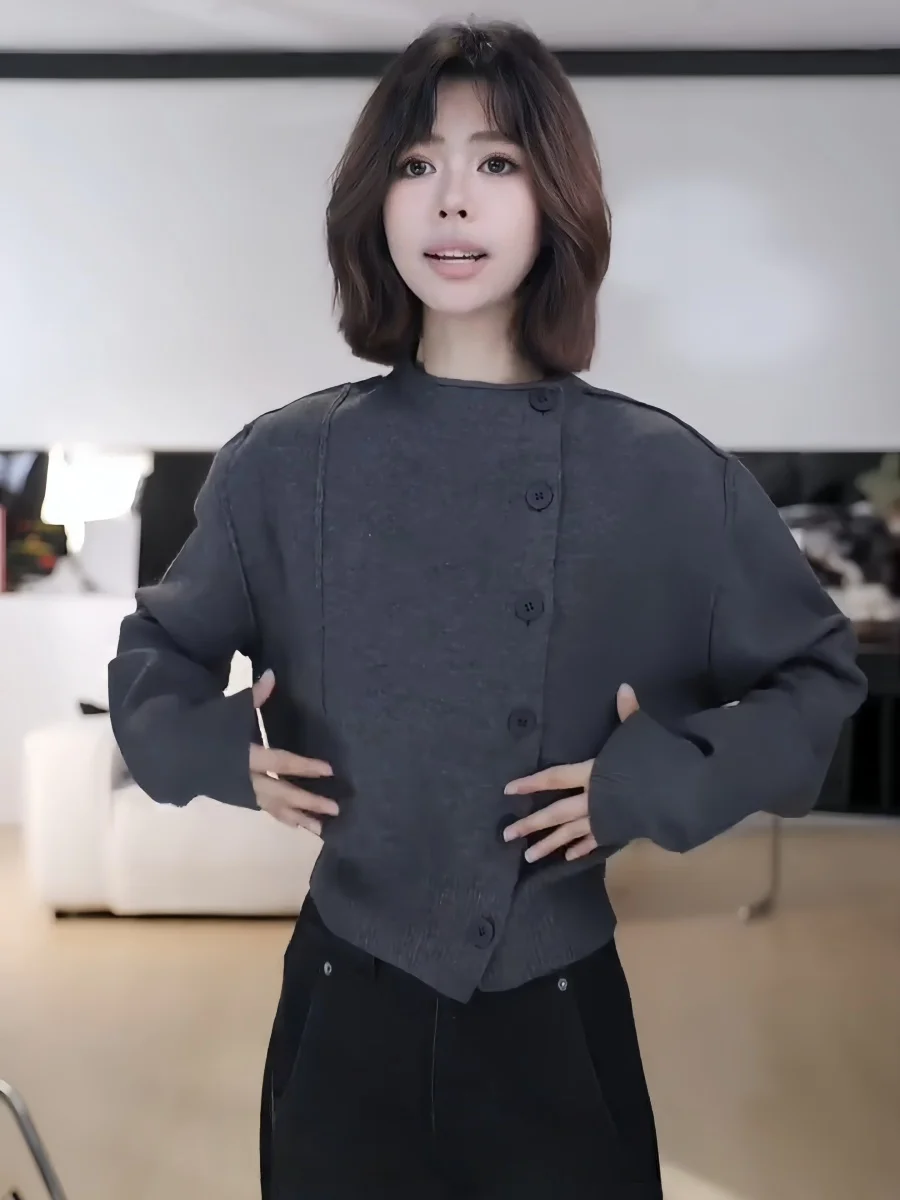 The classic round neck and long sleeves make this cardigan a versatile piece for various outfits.