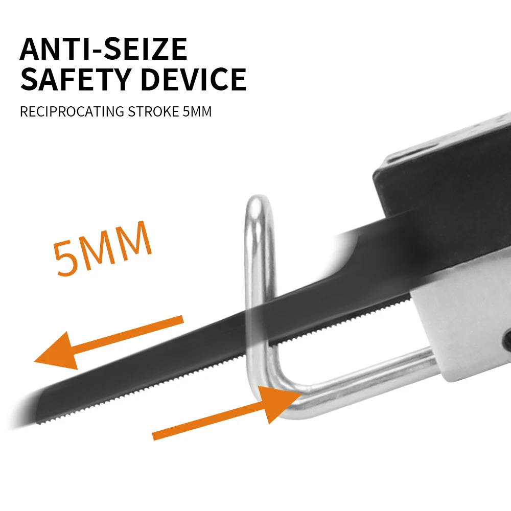 This air body saw is equipped with adjustable metal blade guard to ensure precise cuts and avoid injury. And built-in safety trigger can effectively prevent accidental start. Besides, exhaust design can protect human body from dust.