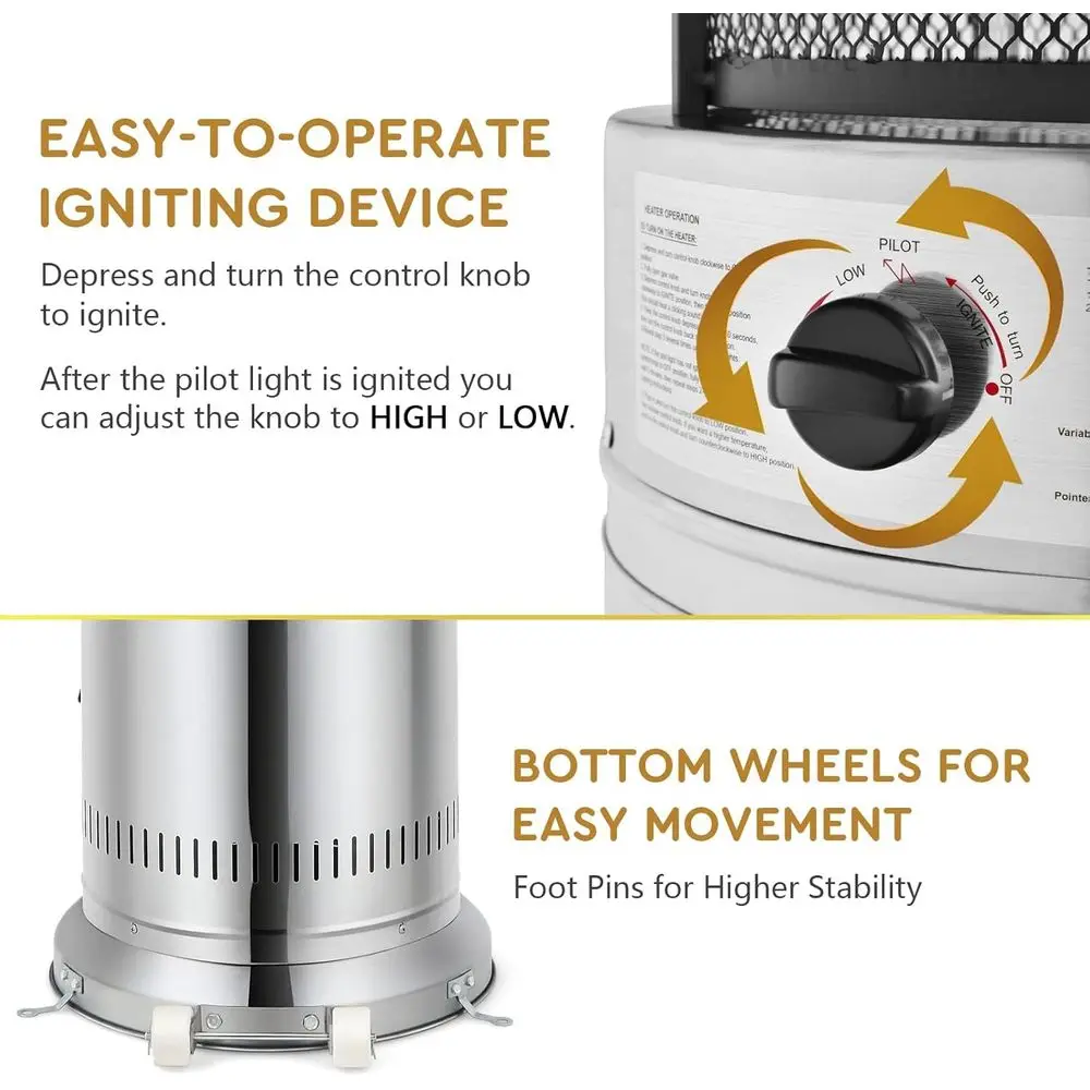 - Multi-Purpose Use: Made of durable steel, this heater is resistant to rust and corrosion. Its two bottom wheels make it portable, saving time and effort. Ideal for backyards, decks, gardens, and other outdoor spaces.