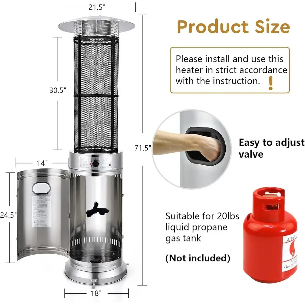 Assembly: Assembly is straightforward with complete accessories and detailed instructions included. A 20lbs propane cylinder tank is required for operation. The heater measures 21” x 21” x 72” (L x W x H).