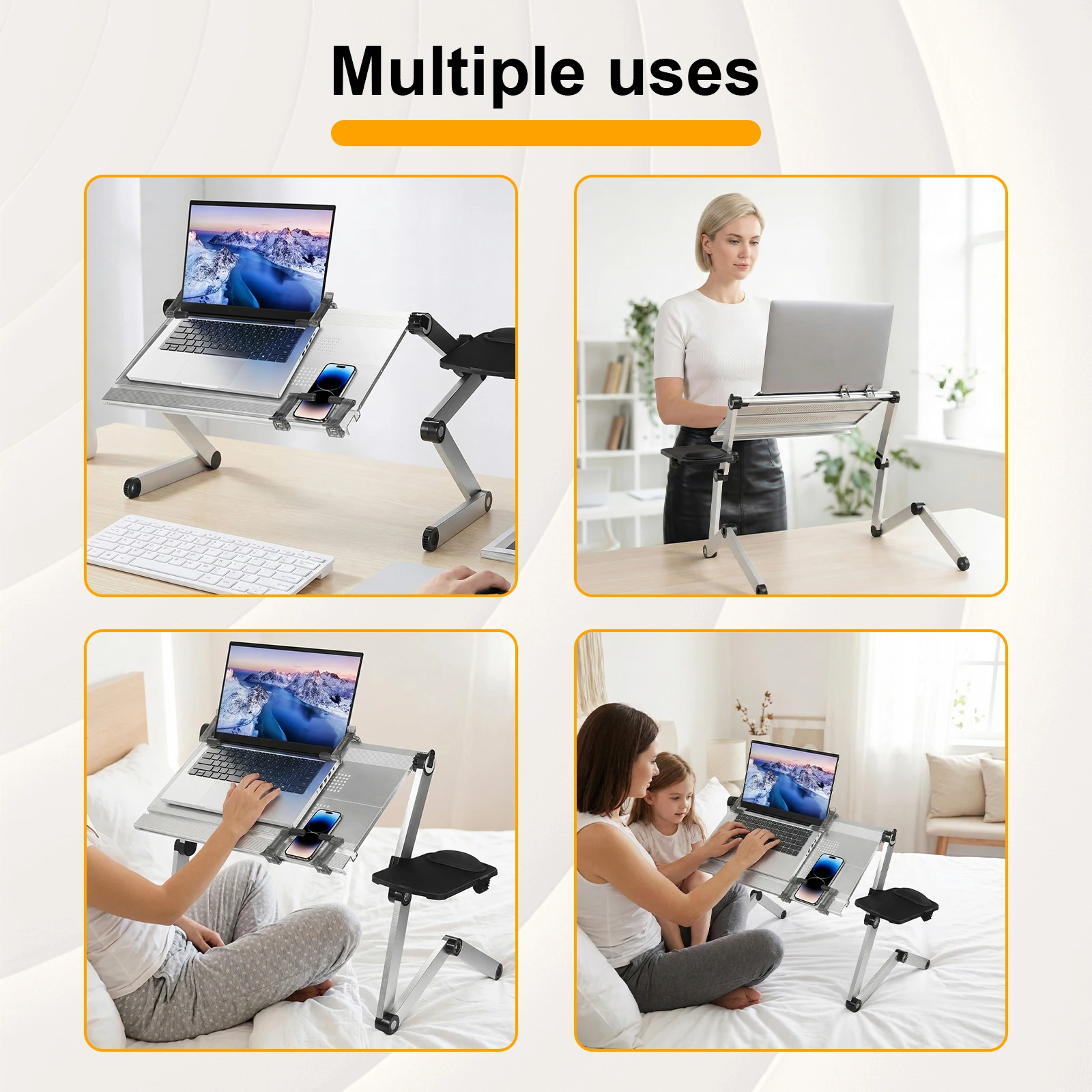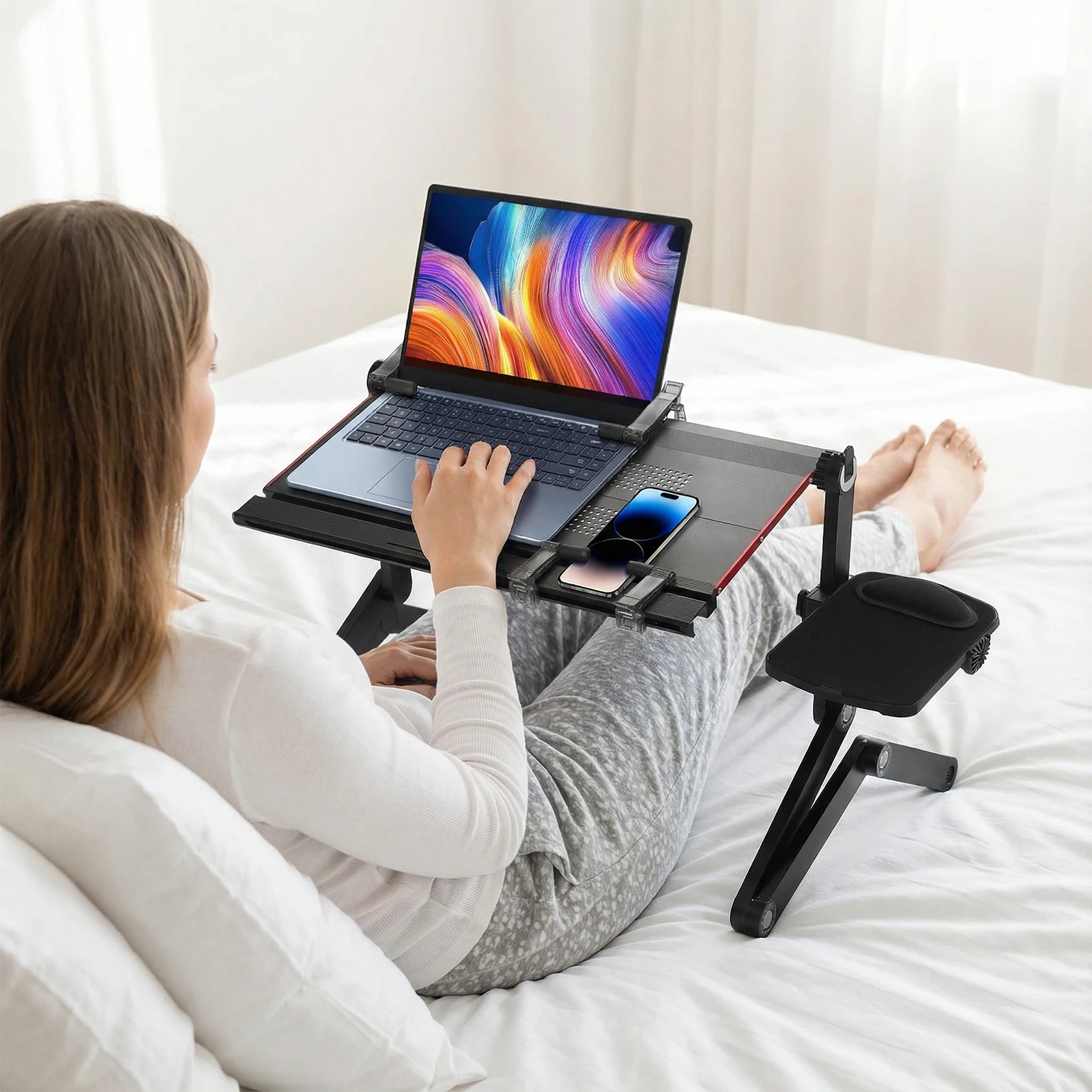 3.Universal Elastic Clamp: No more worries about device thickness! The laptop bed desk includes ultra-flexible clamps that securely grip everything from slim tablets to heavy laptops and books in seconds, offering effortless, hands-free convenience for reading, video calls, or multitasking.
