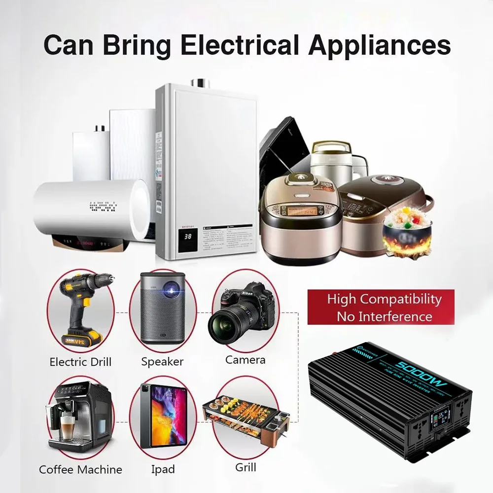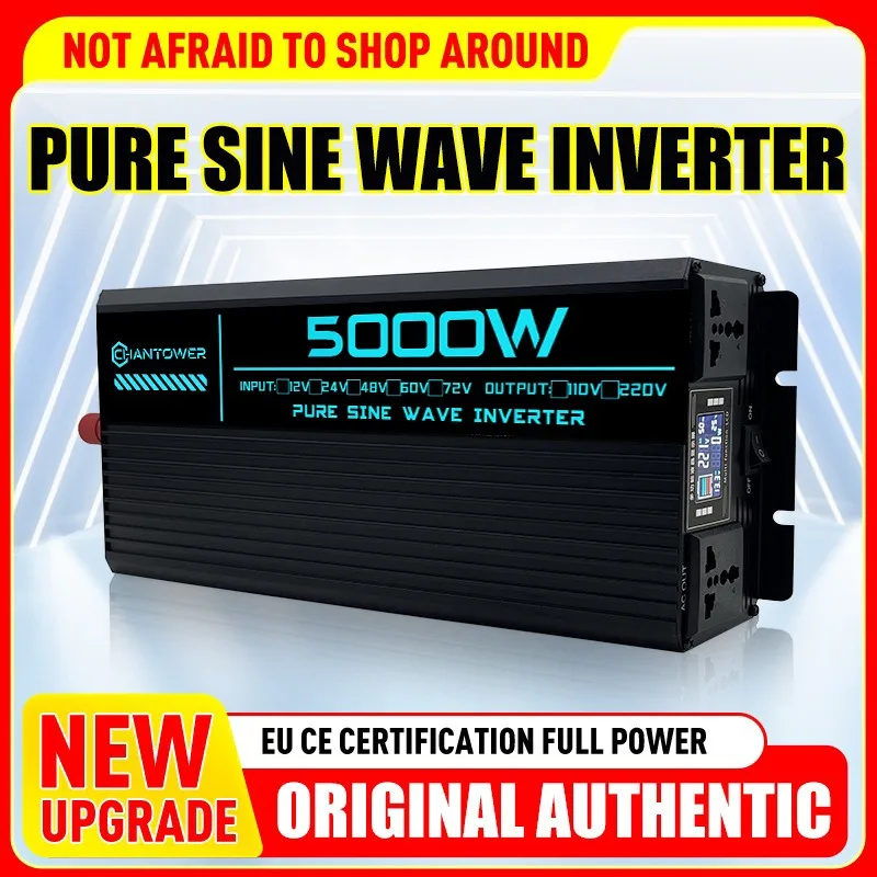 The CHANTOWER 5000W inverter converts 12V DC to 110V/220V AC, delivering clean, stable, and high-efficiency power for your devices anytime, anywhere. With 2200W continuous and 5000W peak power, it easily supports most home and outdoor appliances.