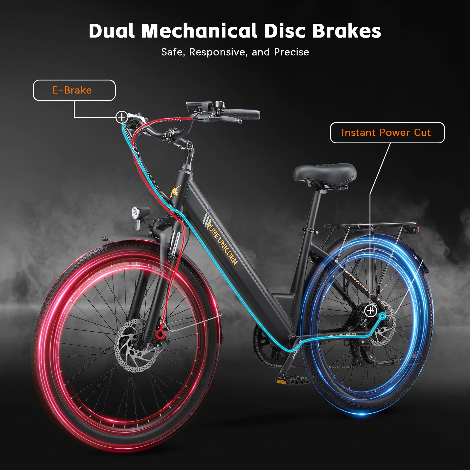 If your PURE UNICORN e-bike features dual-drive or high-power motors, use dual motor mode when climbing hills or riding at high speeds to avoid overloading the rear controller. Prolonged single-drive use under high load may cause overheating.