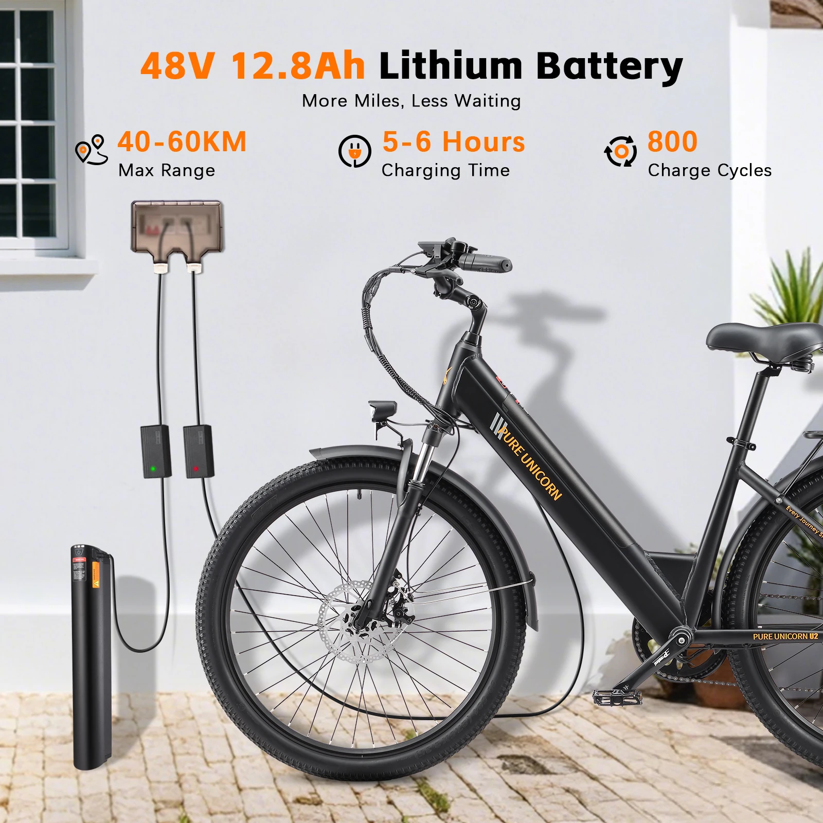 3. Long Range: 48V 12.8Ah removable battery delivers up to 60km per charge.