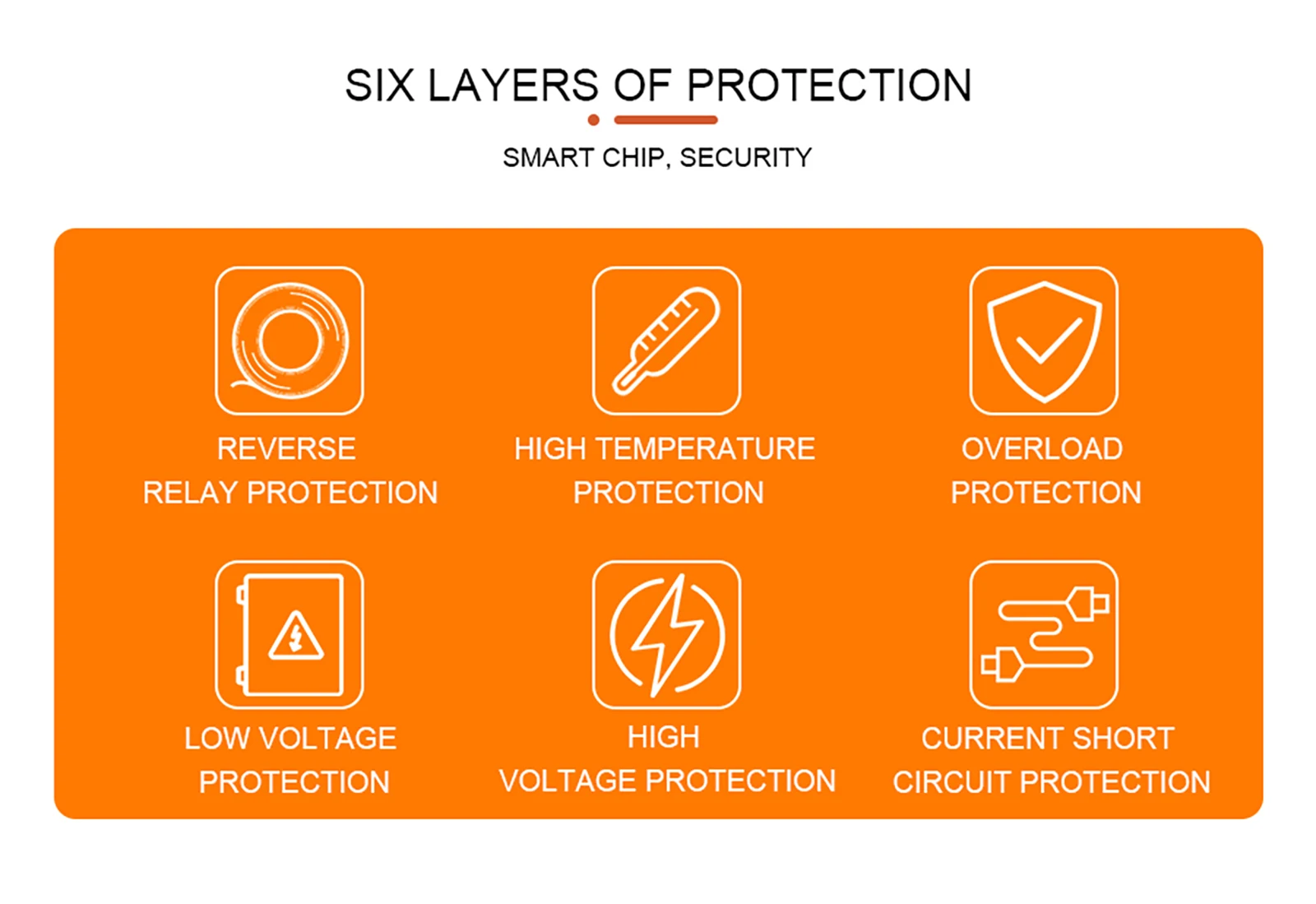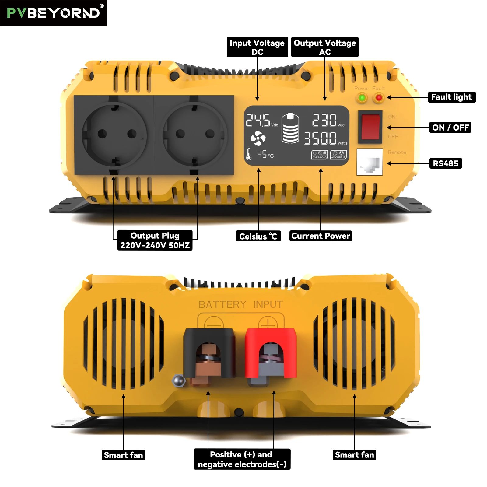 High voltage protection: 12V model high voltage protection is 15V±4%, 24V model high voltage protection is 30V±4%, 48V model high voltage protection is 60V±4%. When the high voltage protection is triggered, the inverter will automatically shut down