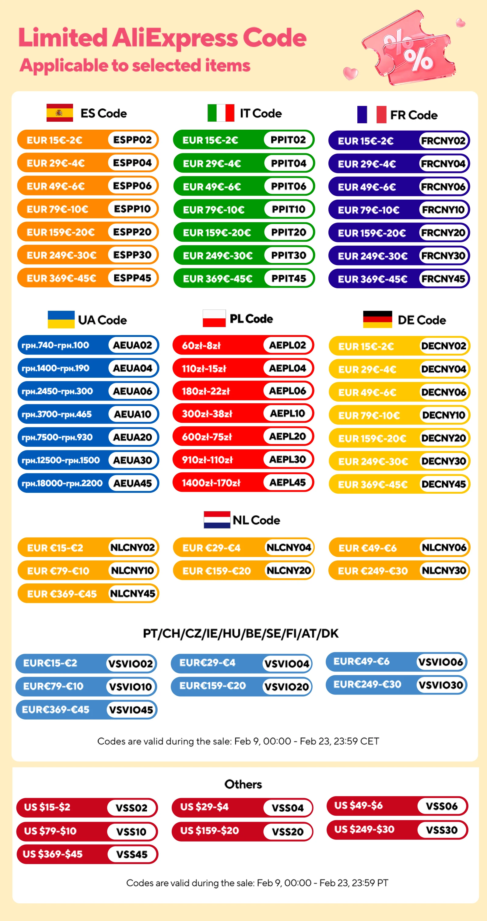 Dear friends, you can enjoy even more discounts and lower prices by using the discount codes we’ve partnered with Aliexpress when paying for your orders.