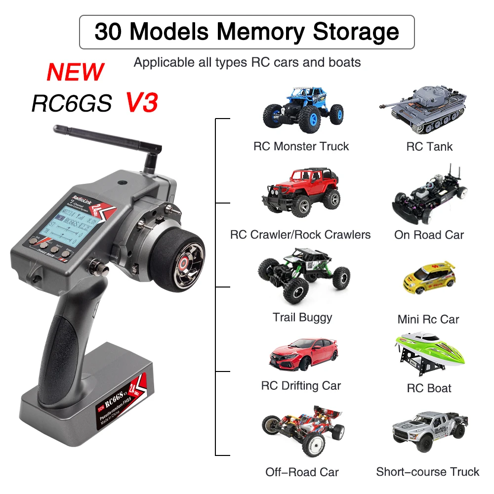 This transmitter, having 7 channels, allows it to be used in different RC devices, for example in Tamiya trucks, which need several channels for all their functions.