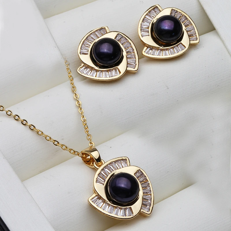 Real Natural Freshwater Set With Pearl Earrings And Necklace Woman,Gold Plated Pearl Set Wife Mother Gift Whife Pink Gray Black |