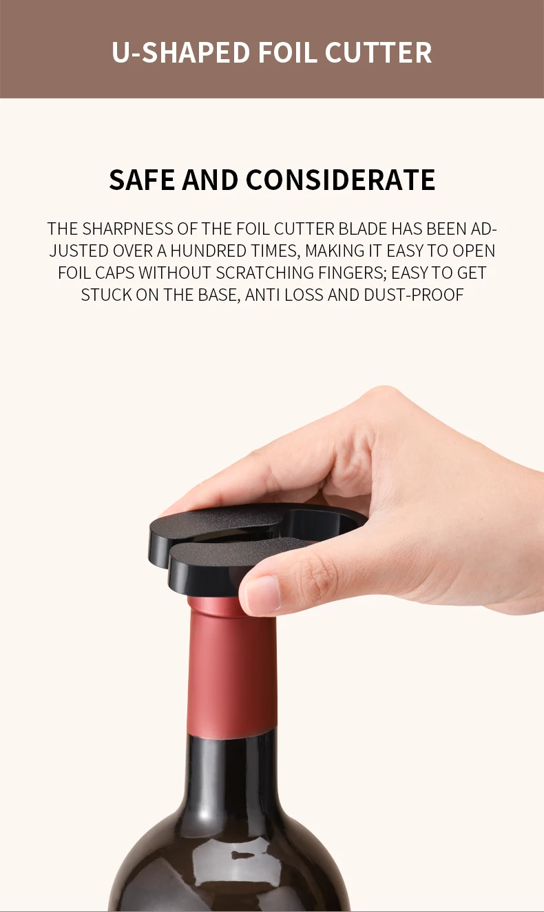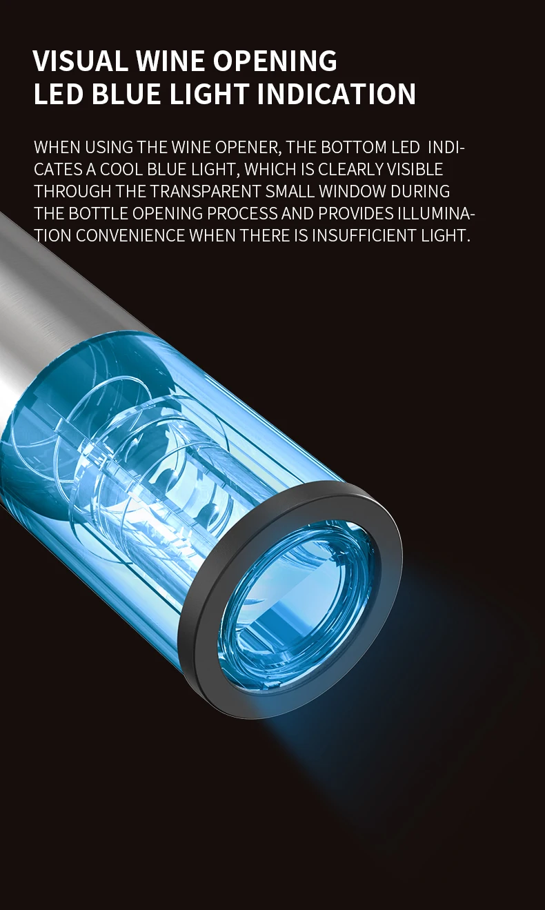 Ergonomically designed for comfort, it enhances the overall user experience. The built-in LED light illuminates the bottle’s neck during operation, ensuring precise use in any lighting condition. The quiet operation minimizes noise, allowing you to open wine in a serene environment without disturbing the party atmosphere