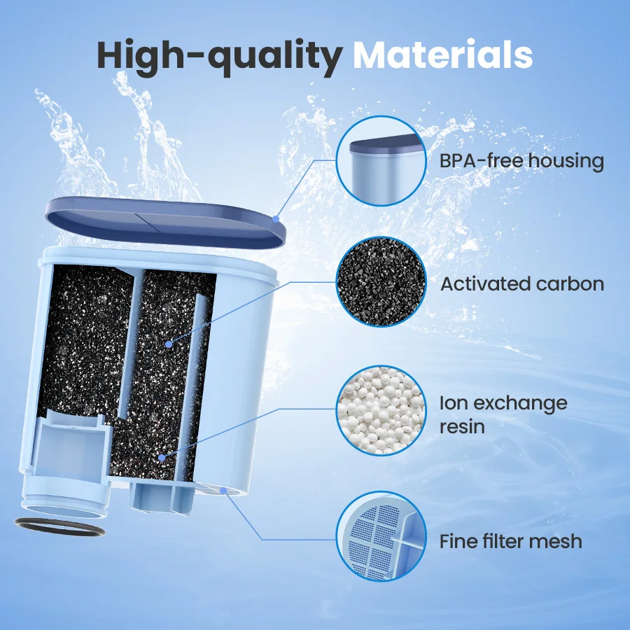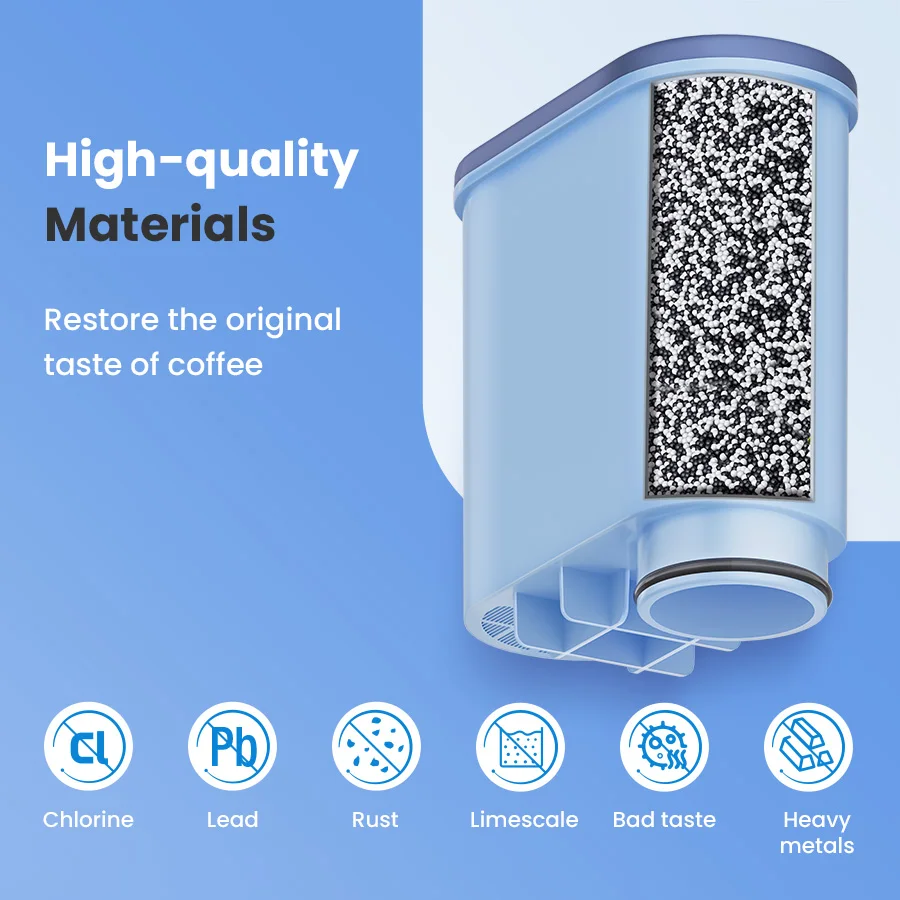 The CMF009 Coffee Machine Water Filter is made from high-quality activated carbon, which significantly enhances your coffee’s quality by reducing chlorine and impurities, improving the taste of your brew.