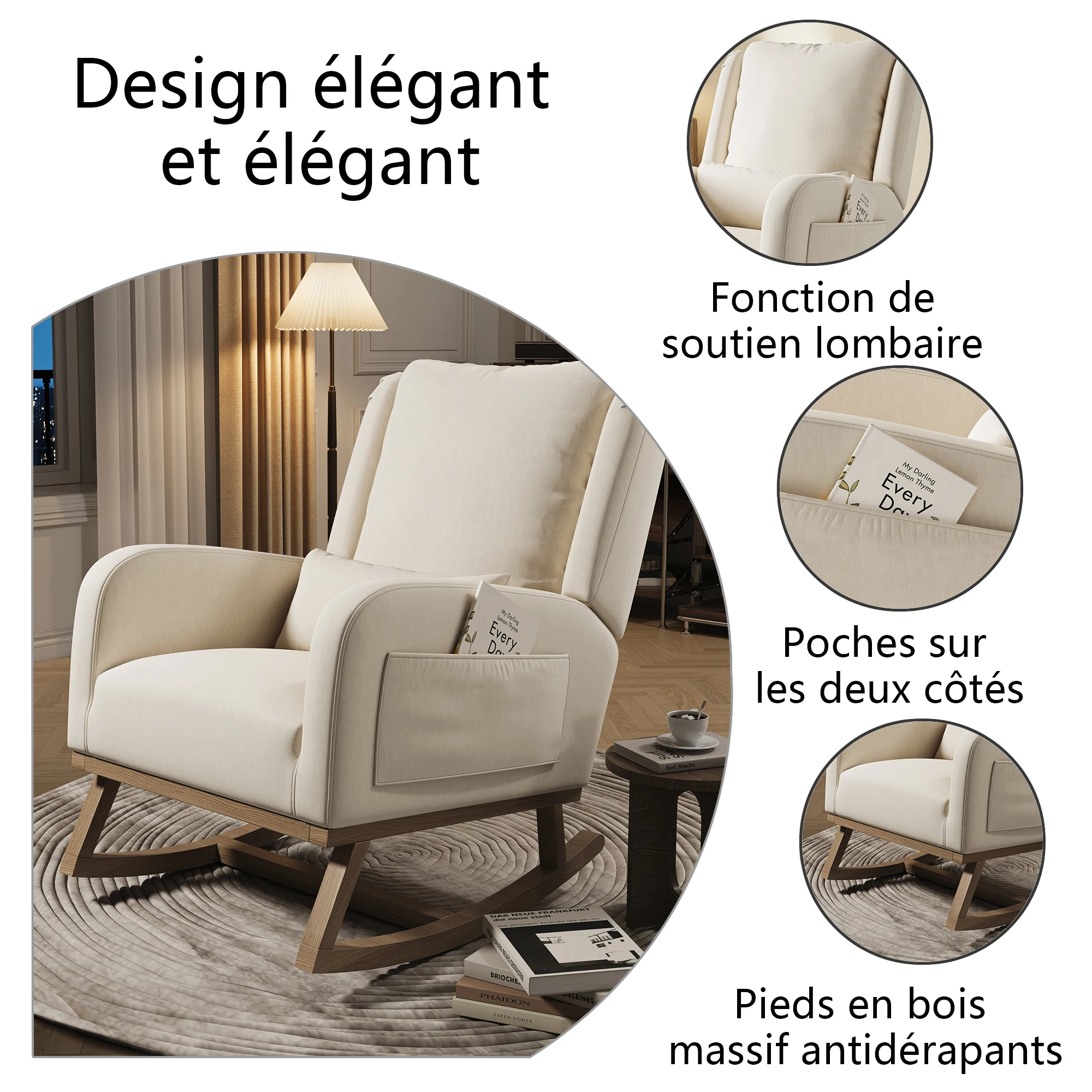 Ergonomic design for optimal comfort: The top backrest and two side armrests perfectly fit your body’s natural curves. This rocking armchair offers you enhanced support to relieve fatigue and guarantee impeccable sitting comfort, ideal for moments of relaxation after a long day.
