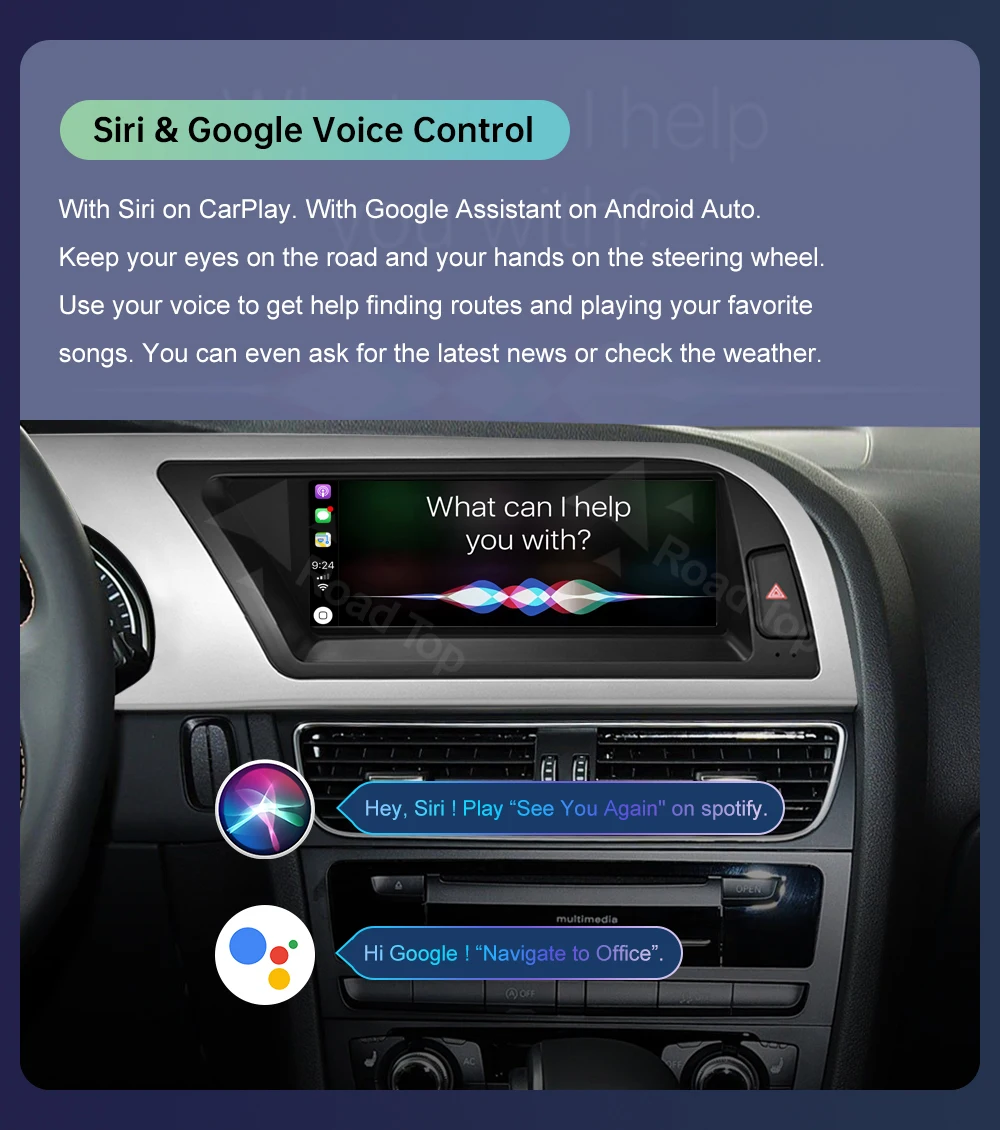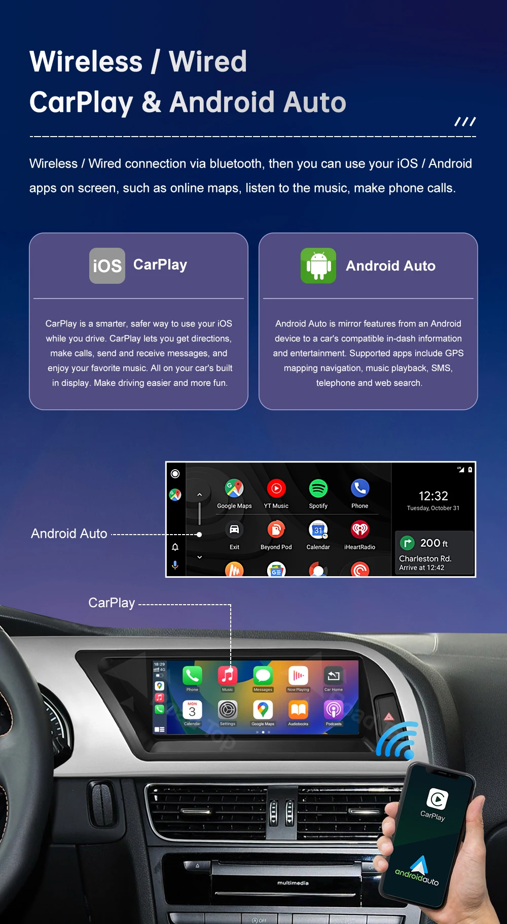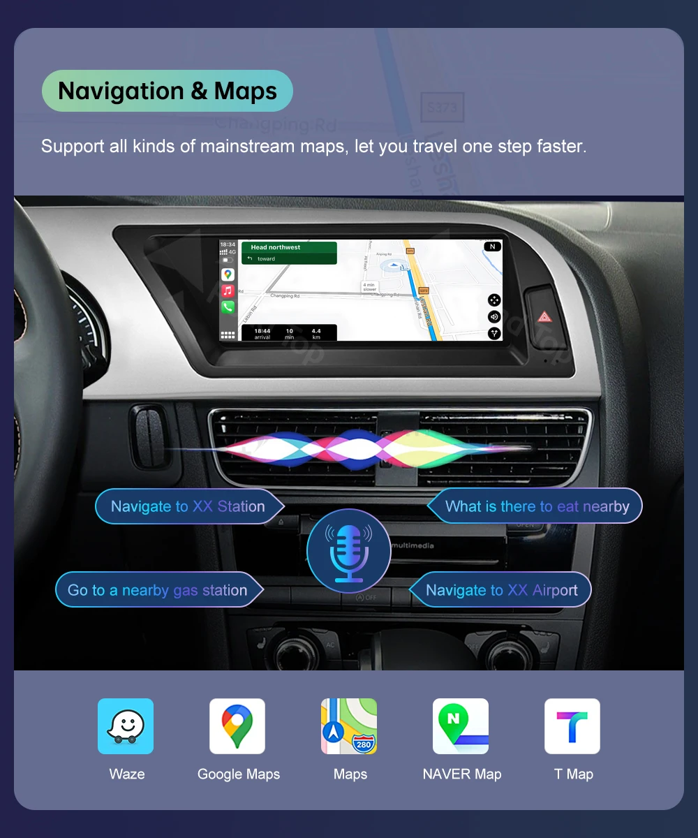 This amazing kit adds full CarPlay functionality to your existing head unit while retaining all the original head unit features. Whether your head unit system is factory-equipped with navigation, phone module or Bluetooth, whether it's Apple Maps, Spotify, making/receiving calls or using Siri to reply to text, the system fully supports Apple systems and phone features. The CarPlay system supports button and steering wheel control and is integrated with the console or glove box USB.
