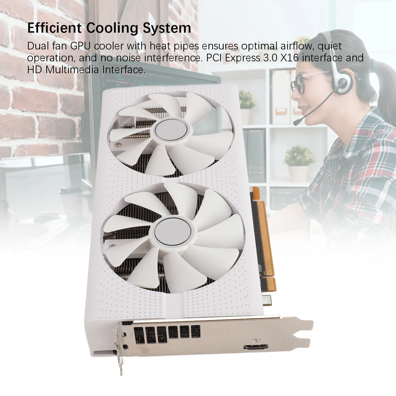 4. Efficient Cooling System: Dual fan GPU cooler with heat pipes ensures optimal airflow, quiet operation, and no noise interference. PCI Express 3.0 X16 interface and HD Multimedia Interface.
