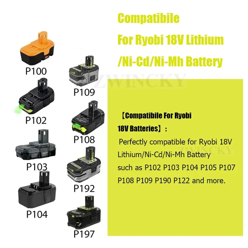 * Fit for Ryobi 18V Battery: For Ryobi 18 Volt Lithium-Ion Batteries: P102 P103 P104 P105 P107 P108 P109 P190 P122 and more.