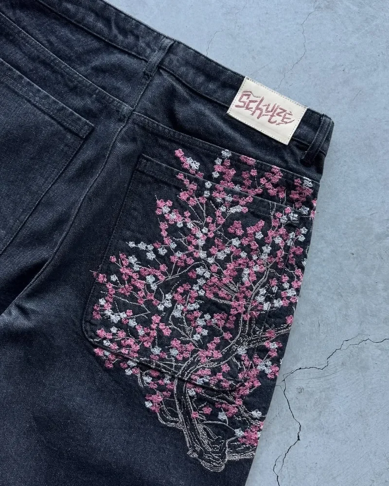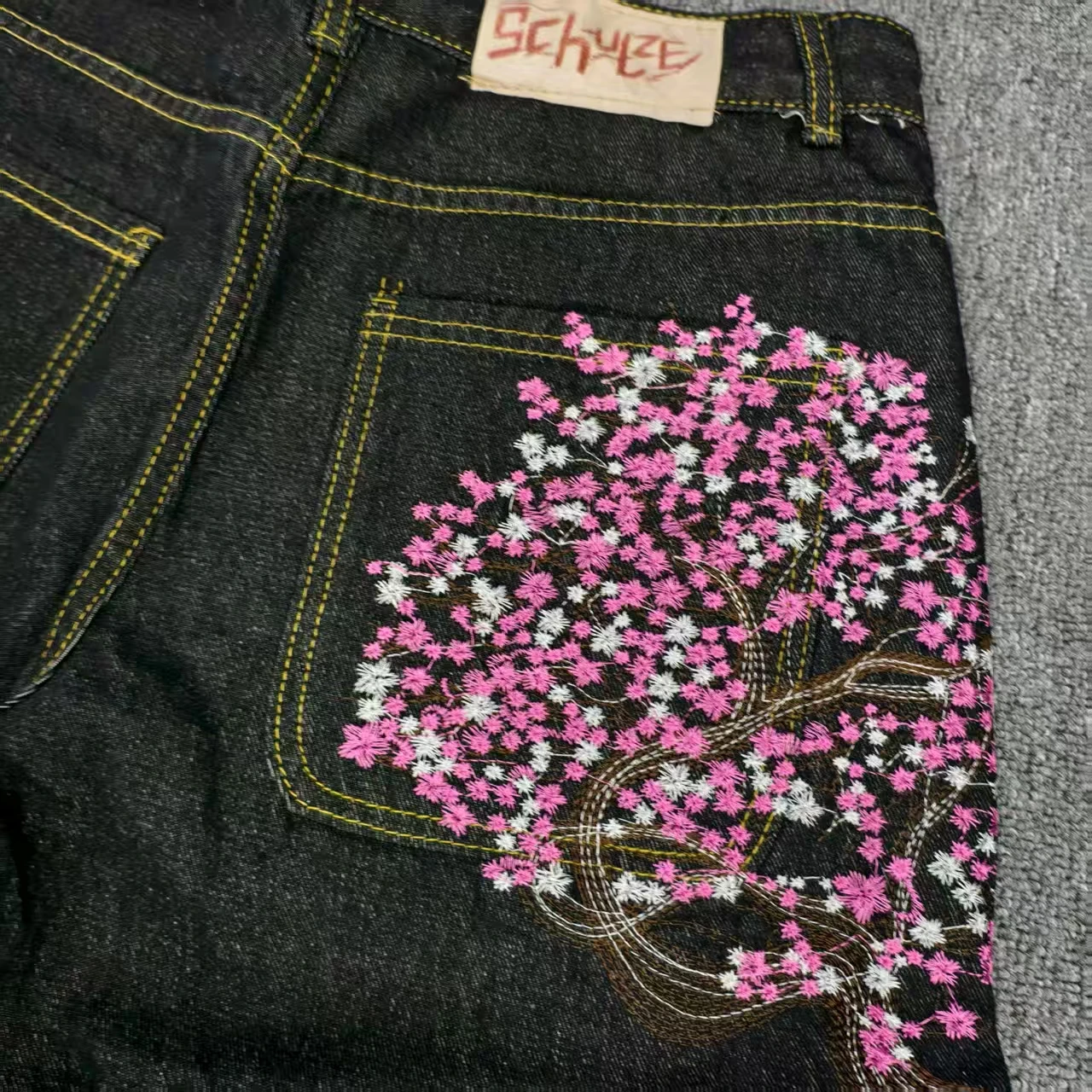 Sakura Pocket Embroidery Fashion Casual Men and Women Washing Jeans Retro Hip Hop oversize Vintage Loose Wide-leg Shorts