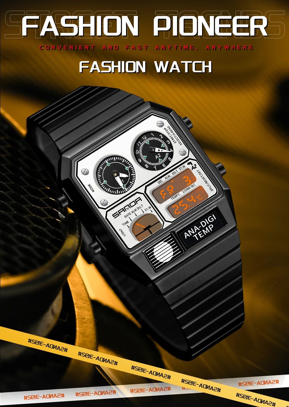 Very faithful tribute to the Citizen Ana Digi. Good quality, presence and a module with good features: alarm, chrono, date, calendar, dual time and thermometer. The 2 analog watches are not “compatible”; they can be configured to display another time zone, the time of day, seconds or the alarm.