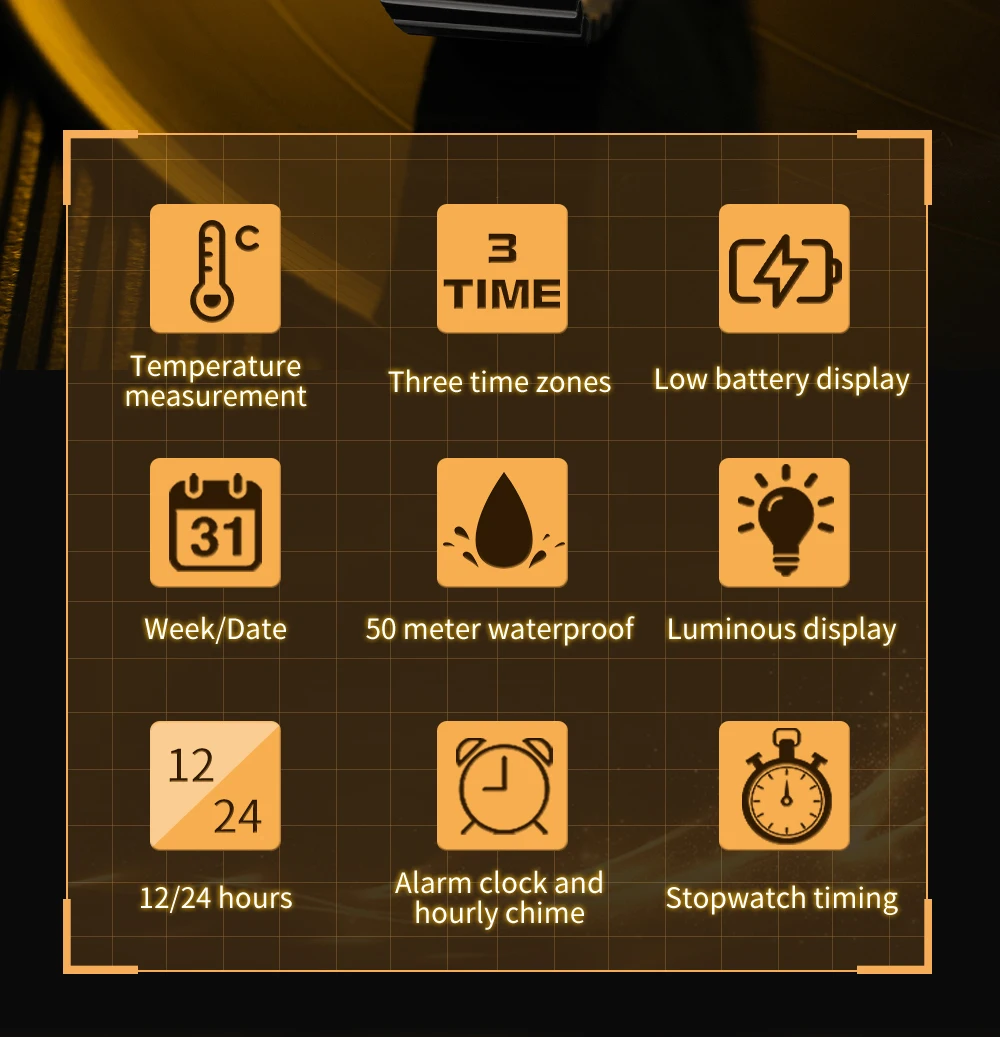12 hour stopwatch, alarm, dual time, date, normal time
