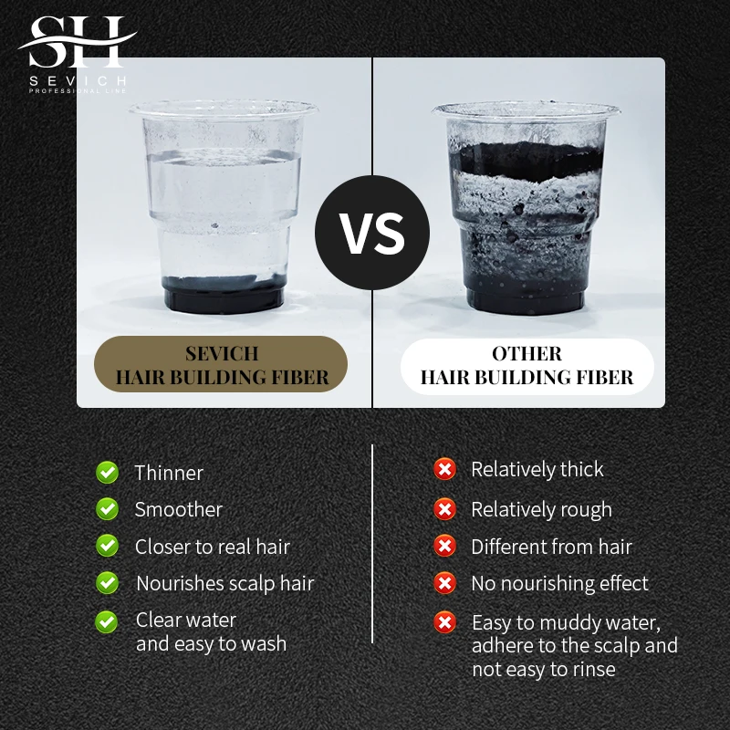 First of all, each factory has its own color definition, so the color of each brand's hair is a little different. Secondly, SEVICH's bottle size is marked as 25g, but Toppik's mark is 27.5g. In fact, the powder inside is about 23g-25g. Thirdly, the bottle shapes of SEVICH and Caboki are different. Finally, Caboki uses cotton fibers, Toppik uses keratin fibers, and SEVICH has both.