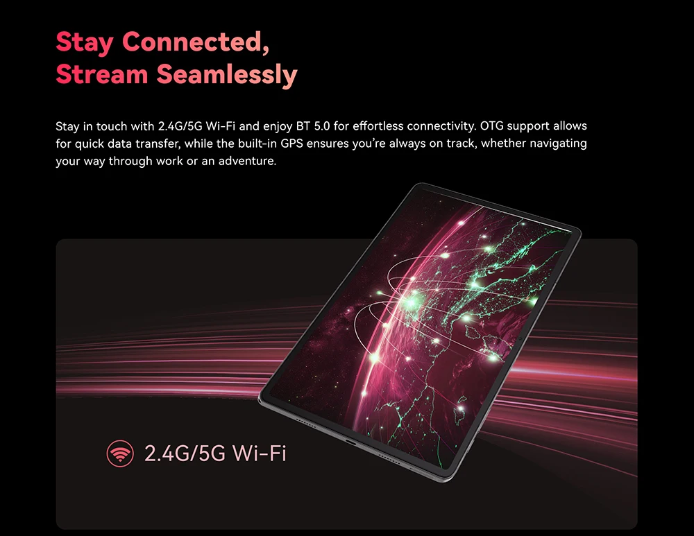 Stay in touch with 2.4G/5G Wi-Fi and enjoy BT 5.0 for effortless connectivity. OTG support allows for quick data transfer, while the built-in GPS ensures you’re always on track, whether navigating your way through work or an adventure.